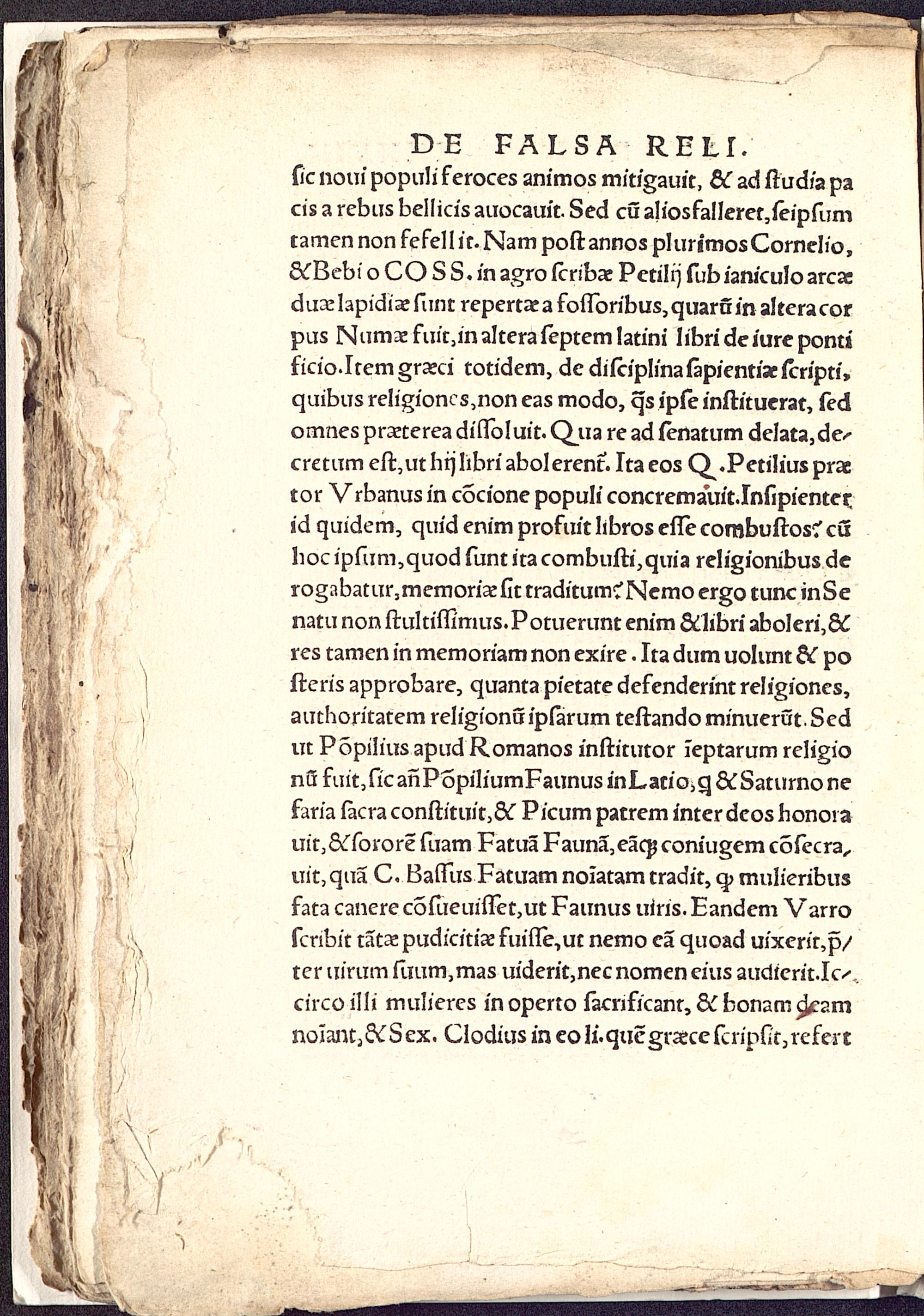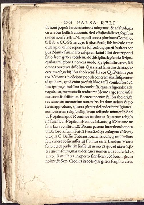 DE FALSA RELI.{ic noui populi feroces animos mitigauit, 6C ad ftudia pacis a rcbus bellicis auocauit. Sed cu aliosfalIeret,ieipfumtamen non fefel I it. Nam poft annos plurimosCornelio,dCBebi o C O S S. in agro Icribae Petilrj fub faniculo arcaeduarlapidiaefunt repertaeafo{Toribus,quar5inalteracorpus Numaefuitjinalterafeptemlatini librideiurcpontificio.Itemgraeci totidem, dedifciplinafapientiaeicript!,quibus religioncs,non eas modo, qs ipfe inftituerat, fedomnes praeterea diflbluit. Qua re ad (enatum delata,de^cretum eft,ut hrjhbri abolerent. Ita eos CKPetilius praetor Vrbanus in cocione populi concremauit.Infipienter,id quidem, quid enim profuit hbros efie combuftos? cuhoc ipfum ,quod funt ita combufti,quia religionibus derogabatur,memoriae fit traditum? Nemo ergo tunc inSenatu non ftultiflimus.Potuerunt enim cVlibri aboleri,8£res tamen in memoriam non exire. Ita dum uolunt cV pofteris approbare, quanta pietate defenderint religiones,authoritatem religionuipfarum teftando minuerut. Scdut Popilius apud Romanos inftitutor kptarum religion5 fuit,ficahPopih'umFaunus inLatio,cj cVSaturno nefaria facraconftituit,8c' Picum patrem interdcoshonorauitjCxffovore fuam Fatua Fauna,eaqj coniugem cofecra,uit 3 qua C. Baffiis Fatuam nolatam tradit, q> mulieribusfata canere cofueuiflet,ut Faunus uiris. Eandem Varrofcnbit tataepudicitiaefuifle,ut nemo ca quoad uixerit,p/ter uirum fuum,mas uiderit,nec nomen eius audierit.Io',circoilli mulieres inoperto facnficanr, &C bonam cieamnolant a cVS ex. Clodius in eo li.qucgraece fcrip(it 3 refert