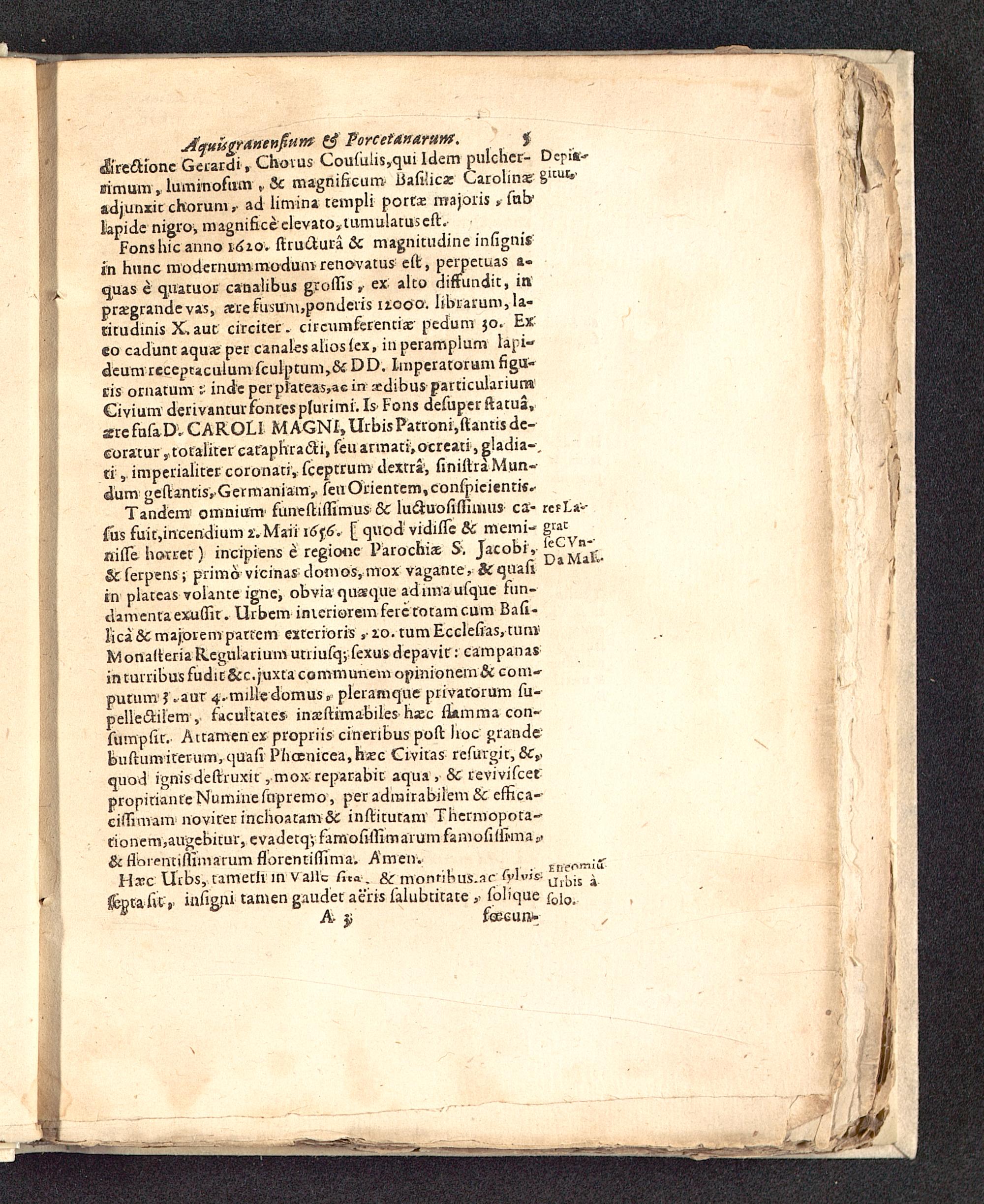 Tandem omnium funeftiflimus & lu<3uofifiunus ca- rc*£aV£us fuitjincendium i.Maii 16 f6. [ quod' vidiflc & memi-- gra £nifle horrec) incipiens e regione Parochis S. Jacobi, leCV "& ferpens; primo vicinas domos, mox vagante, &quafi Da a *'in platcas volante igtic, obvia qusque adimaufque fun-damentaexufiit. Urbcm imcrioremferc totamcum Bafi-lici Sc majorenvpartem extcrioris ,■ zo. tum Ecclefias, tum'MonafteriaRcgulariumuciiufq-, fexus dcpavit: campanasinturribusfudic&c.juxtacommuneiuopinioneincVcoiii--puriim ? . aur 4. mille domus,, pleramque privaforum fu-pelle&iiem , facuitates. inarftimabiles hasc llamma con-fumpfir. Aitamenex propriis cinenbus poft lioc gr.mdebuftumicerum, quali Piiaenicea,h:ee Civitas refurgit,quod ignis deftruxit, mox reparabic aqua , & revivifcerpropiriante Numinefnpremo, peradrairabiiem & efhca--ciflinvam noviter inchoatam & inftitutam Thermopota-'fionem,augcbicur, evadetq- famofiliimaiuinfaniofiifi'ma s .& florentifliimrum florentilfima. Amen.