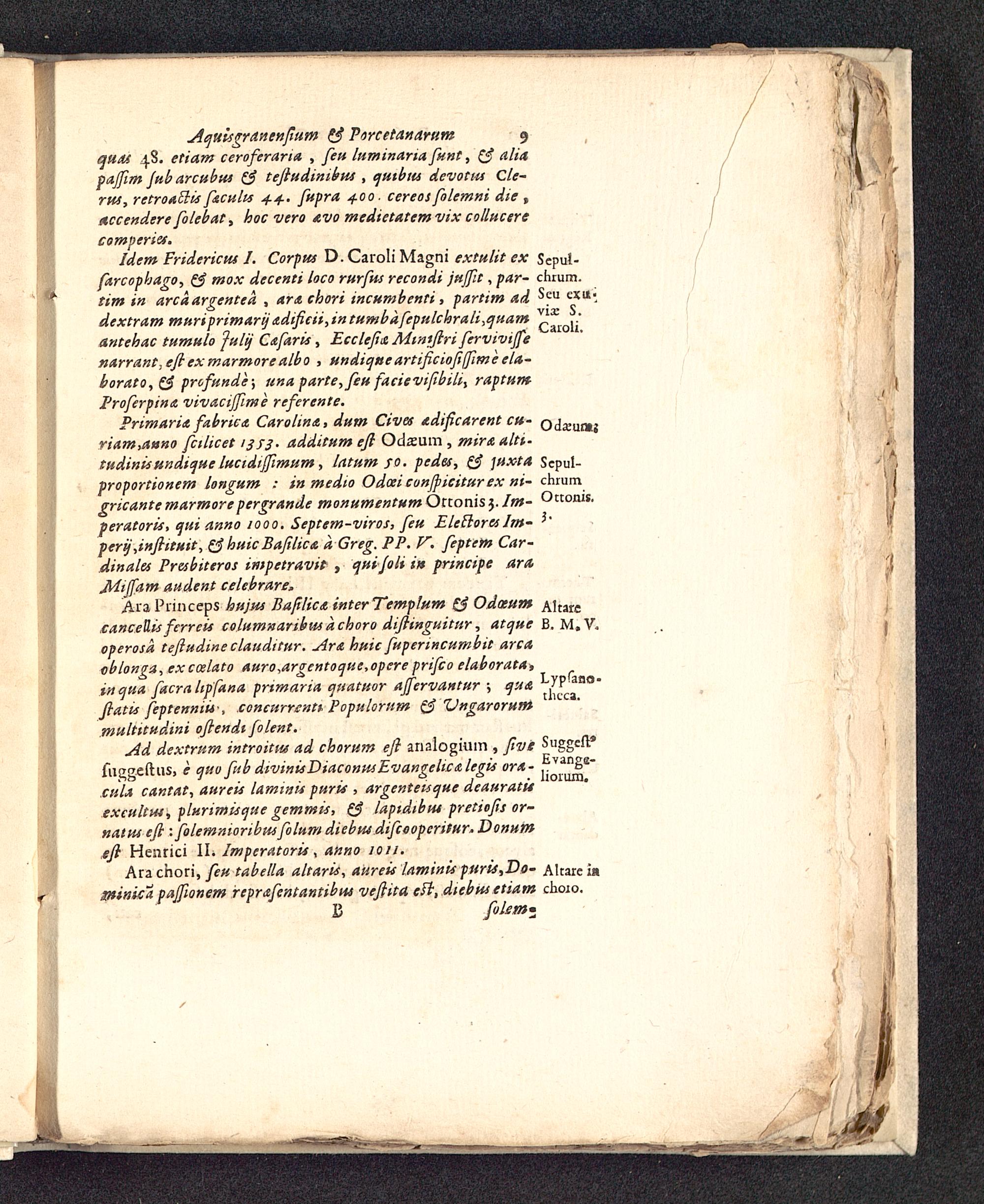 Idem Friderictu I. Corptes D. Caroli Magni extulit ex Sepul-farcophago, & mox decenti loco rurfus recondi jujfit , par- cfirum.tim in arcaargentea , ara chori incumbenti, partim ad S £U exit-dextram muriprimarijadificii,intumbafepulchrali,quam £* 0 yantehac tumulo fulij Cafaris, Ecclefiiz Mtmflri fervivijfenarrant,efiexmarmorealbo , undicjttcartificiofiffime ela-borato, & prcfunde; ttna parte,feu facievifibi/i, raptumProfcrpina vivacijfime refercnte.