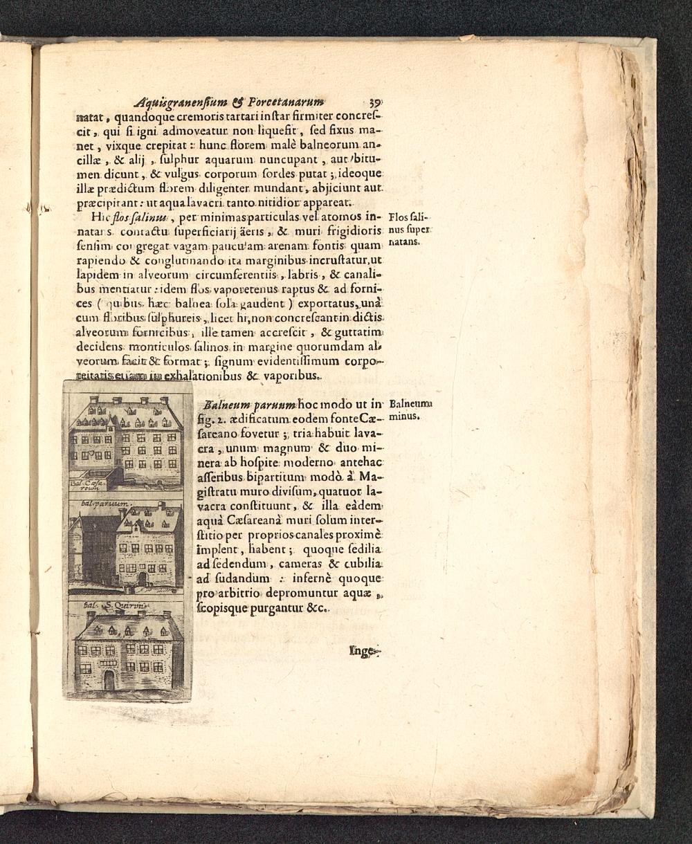 Salneum paruumkoc modo ut in Balneumifig. z. aedificatum eodem fonteCae-- minus,farcano fovetur rriahabuit. lava-cra , unum magnum & duo mi-nera ab hofpite moderno antehacafleribus bipartitum moda i. Ma-giftratu murodivifum.quatuor la-v.acra conftituunt, & illa eademaqua C-efareana. muri folum inter—ftitioper proprioscanalesproximeimplent , habent; quoque fediliaadfedendum , cameras 5c tubilia;ad fudandum : inferne quoquepro arbitrio depromuntur aquas tifcopisque purgantur &c.