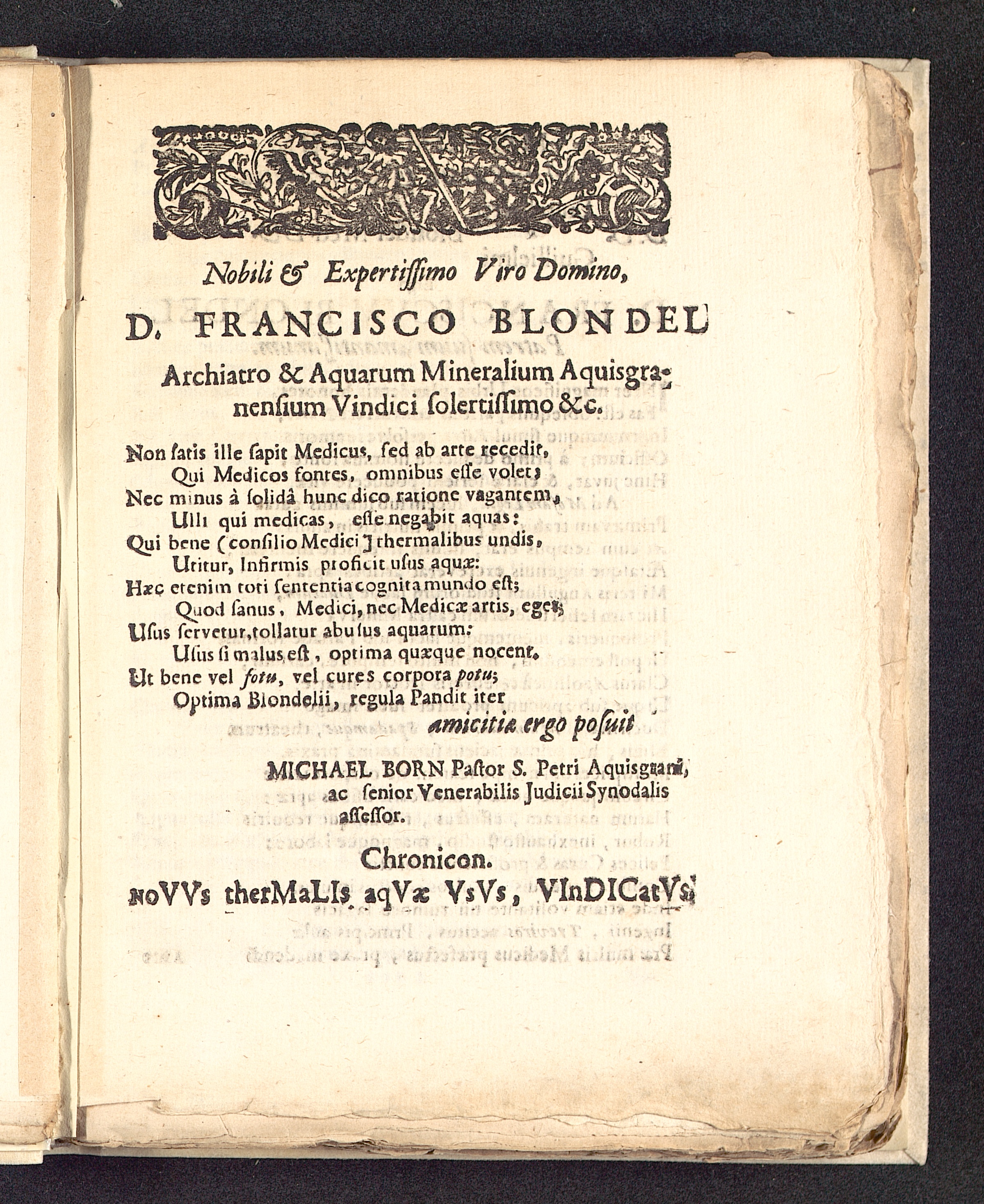 Nobili & Expertissimo Viro Domino, D. FRANCISCO BLONDEL. Archiatro & Aquarum Mineralim Aquisgranensium Vindici solertissimo & c.