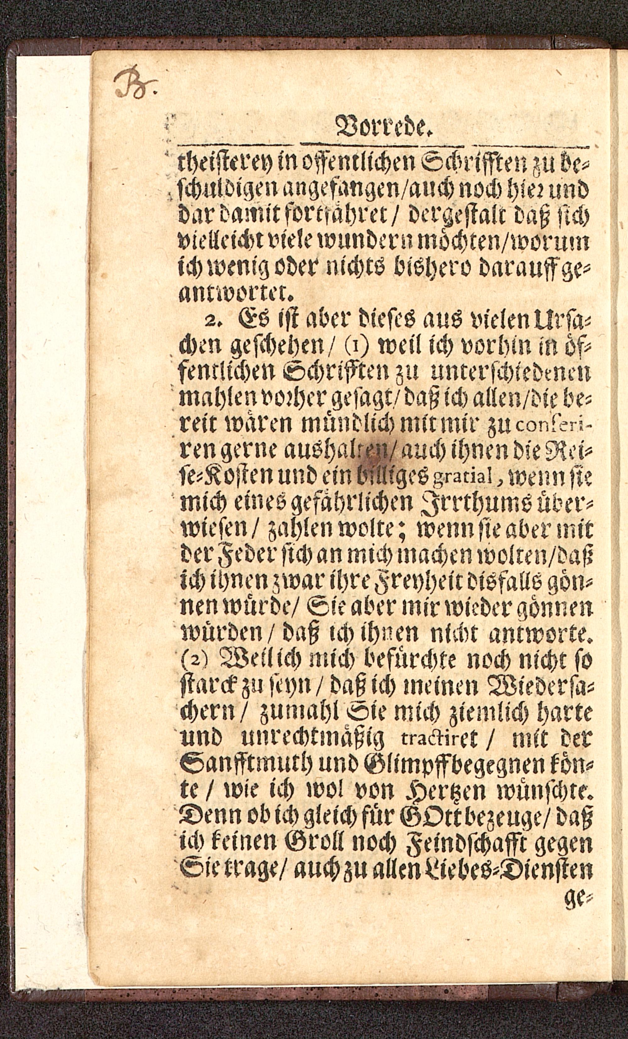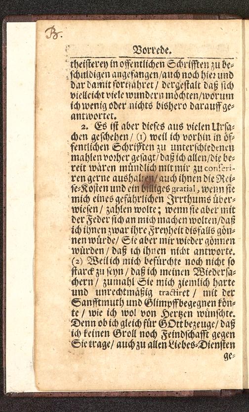 2. Es ist aber dieses aus vielen Ursa-chen geschehen/ (i) weil ich vorhin in öf-fentlichen Schrifften zu unterschiedenenmahlen vorher gesagt/ daß ich allen/die be-reit waren mündlich mir mir zuconl'^i-' ren gerne aushallen/ auch ihnen die Rei-se-Kosten und ein billiges.^nzZ, wenn siemich eines gefährlichen Irrthums über-wiesen/ zahlen wolle; wenn sie aber mitder Feder sich an mich machen wolten/daßich ihnen zwar ihre Freyheit disfalls gön-nen würde/ Sie aber mir wieder gönnenwürden/daß ich thuen nicht antworte.(2) Weil ich mich befürchte noch nicht sosiarckzu seyn / daß ich meinen Wiedersa-chern/ zumahl «te mich ziemlich harteund unrechtmäßig rr^inet / mit derSanfftmuth und Glimpffbegegnen tön-te / wie ich wo! von Hertzen wünschte.Denn ob ich gleich für GOtt bezeuge/ daßich keinen Groll noch Femdschafft gegene?ie trage/ auch zu allen Nebes-Diensten