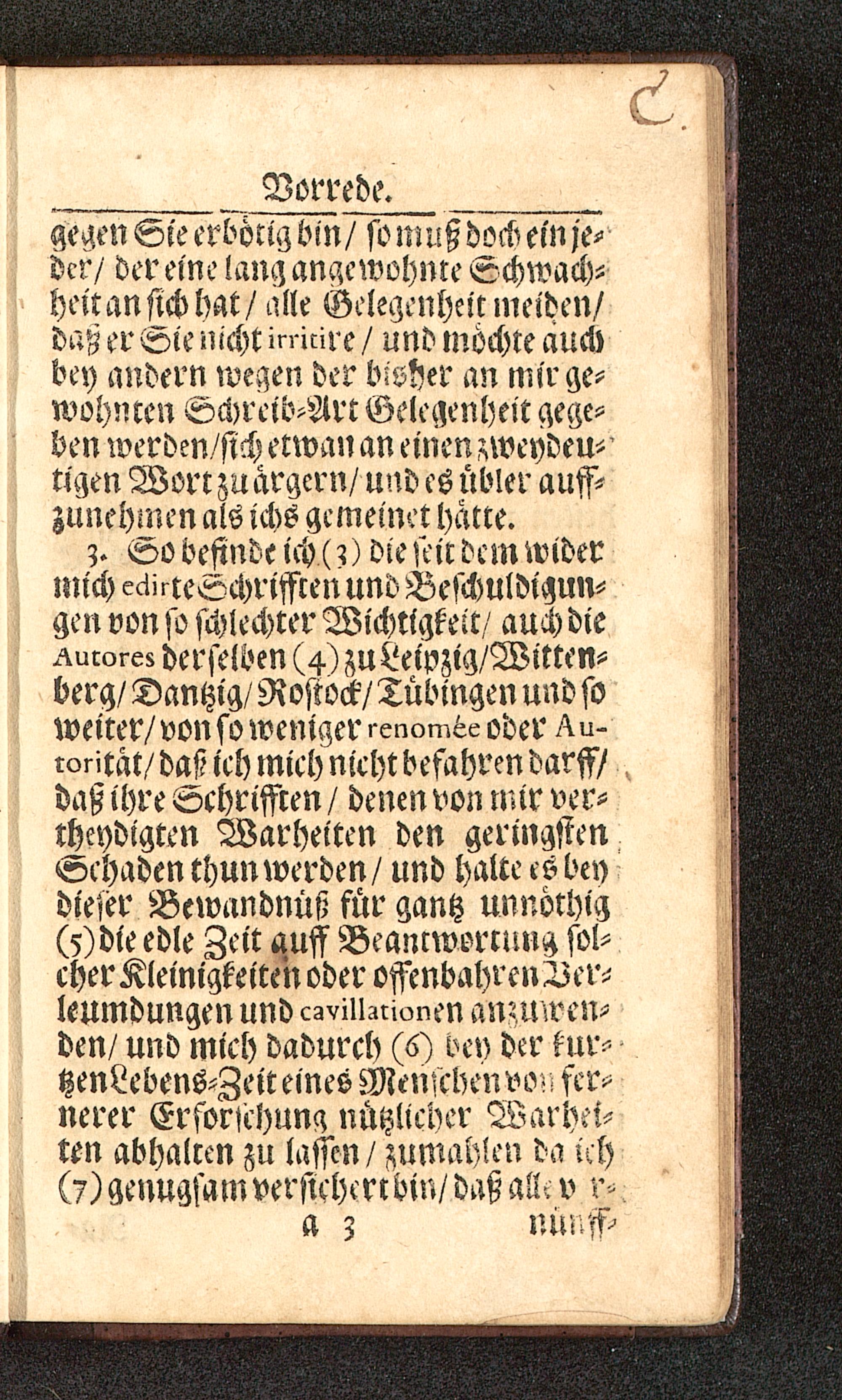 V0 befinde ich (?) die seit dem widermich eciirteSchrifflen und Beschuldigun-gen von so schlechter Wichtigkeit/ auch dieFurore; derselben (4)zuLeipzig/Witten-berg/Dantzig/ Rostock/ Tübingen und soweiter/ von so wenigeroder ^u-roritat/ daß ich mich nicht befahren darff/daß ihre Schriffren / denen von nur ver-theidigten Warheiten den geringstenVchaden thun werden / und halte es beydieser Bewandnüß für gantz unnörhig(5) die edle Zeit auff Beantwortung sol-cher Kleinigkeiten oder offenbahren Ver-leumdungen und cZVllizrionen amuwen-den/ und mich dadurch (6) dev der kur-tzenLebens-Zeit eines Menichenvo^ fer-nerer Ersorlchung nützlicher Warhei-ten abhalten zu lassen / zumahlen da ich(7) genugsam versichenom/ daß alle va 3 nünff-