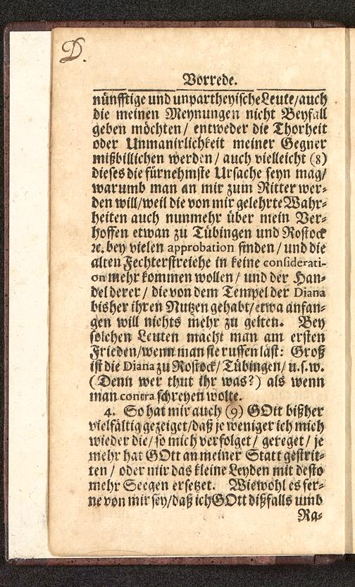 nünsstige und unpartheyischeLeute/auchdie meinen Meynungen nicht Beyfallgeben möchten/ entweder die Thorheitoder Unmanirlicykeit meiner Gegnermißbilltchen werdm/ auch vielleicht (8)dieses die fürnehmste Ursache seyn mag/warumb man an mir Zum Ritter wer-den will/weil die von mir gelehrteWahr-heiten auch nunmehr über mein Ver-gossen etwan zu Tübingen und Rostockzc.bey vielen ApprObsnon finden/und diealten Fechterstreiehe in keine consicierAri.on mehr kommen wollen / und der Han-delderer/ dievondem Tempel der viansbisher ihren Nutzen gehabt/stwa anfan-gen will nichts mehr zu gelten. Beysolchen Leuten macht man am erstenFrieden/wenn man fte ruffenlast: GroßtstdieDiZNÄzuRostock/Tübingen/u.s.w.(Denn wer thut thr was?) als wennman coners schreyen wolte.