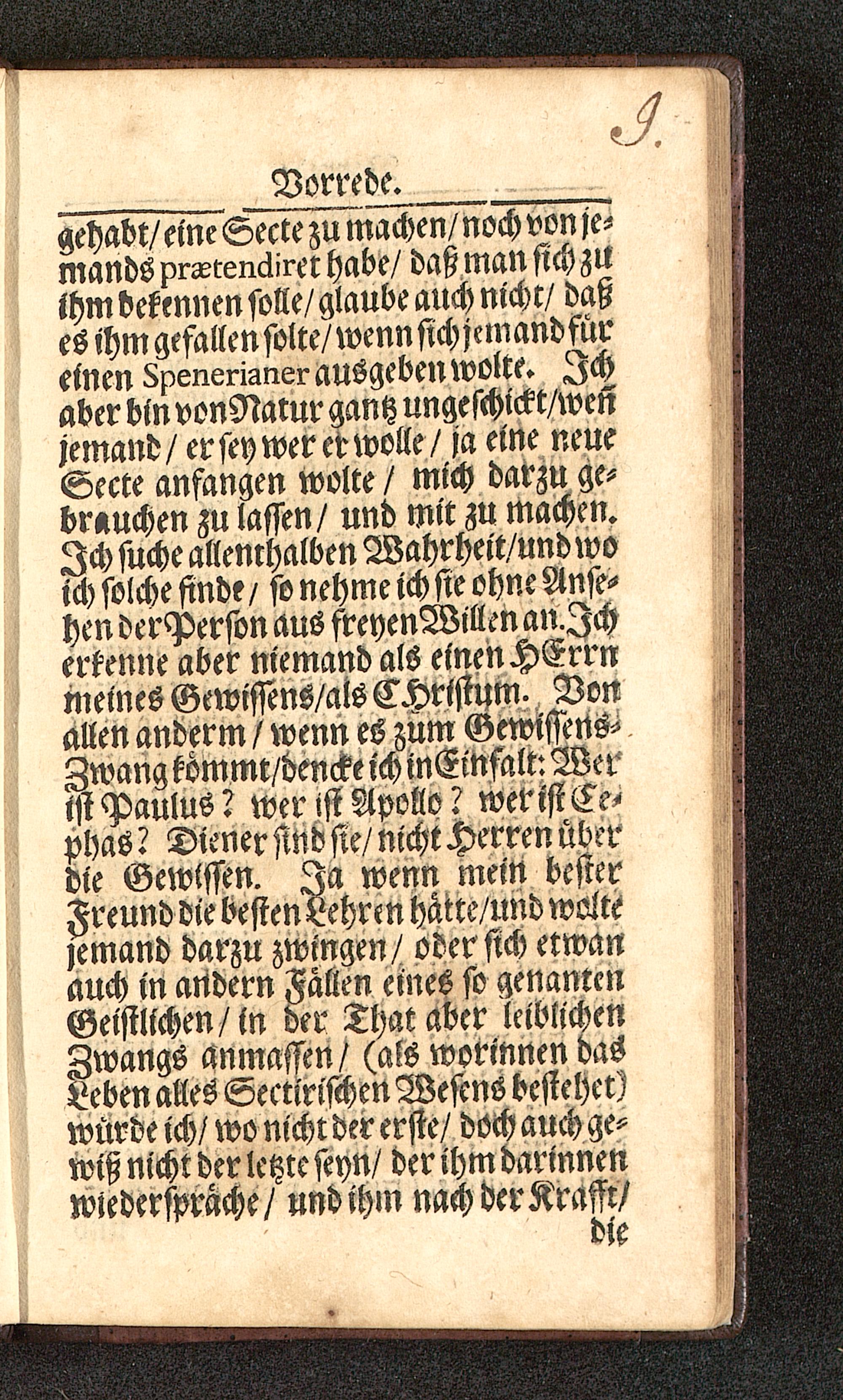gehabt/eine Secte zu machen/noch von je-mands prXtenäirer habe/ daß man sich zuihm bekennen solle/ glaube auch nicht/ daßes ihm gefallen solte/ wenn sichjemandfüreinen 8penerisner ausgeben wolte. Ichaber bin vonNarur gantz ungeschickt/wenjemand/ er sey wer er wolle / ja eine neueSecte anfangen wolte / mich darzu ge-brauchen zu lassen/ und mit zu machen.Ich fuche allenthalben Wahrheit/und woich solche finde/ so nehme ich sie ohne Anse-hen derPerson aus freyenWillm an.Jcherkenne aber niemand als einen HErrnmeines Gewissens/atsCHristum. Vonallen anderm / wenn es zum Gewissens-Zwang kömmt/dencke ich inEinfalt: Werist Paulus? wer ist Apollo? wer ist Ce^phas ? Diener sind sie/ nicht Herren überdie Gewissen. Ja wenn mein besterFreund die besienLehrm hätte/und woltejemand darzu zwingen/ oder sich etwa»auch in andern Fallen eines so genantenGeistlichen/in der That aber leiblichenZwangs anmaßen/ (als worinnen dasLeben alles Sectiristhen Wesens bestehet)würde ich/ wo nicht der erste/ doch auch ge-wiß nicht der letzte seyn/ der ihm darinnenwiderspräche/ und ihm nach der Kraffr/