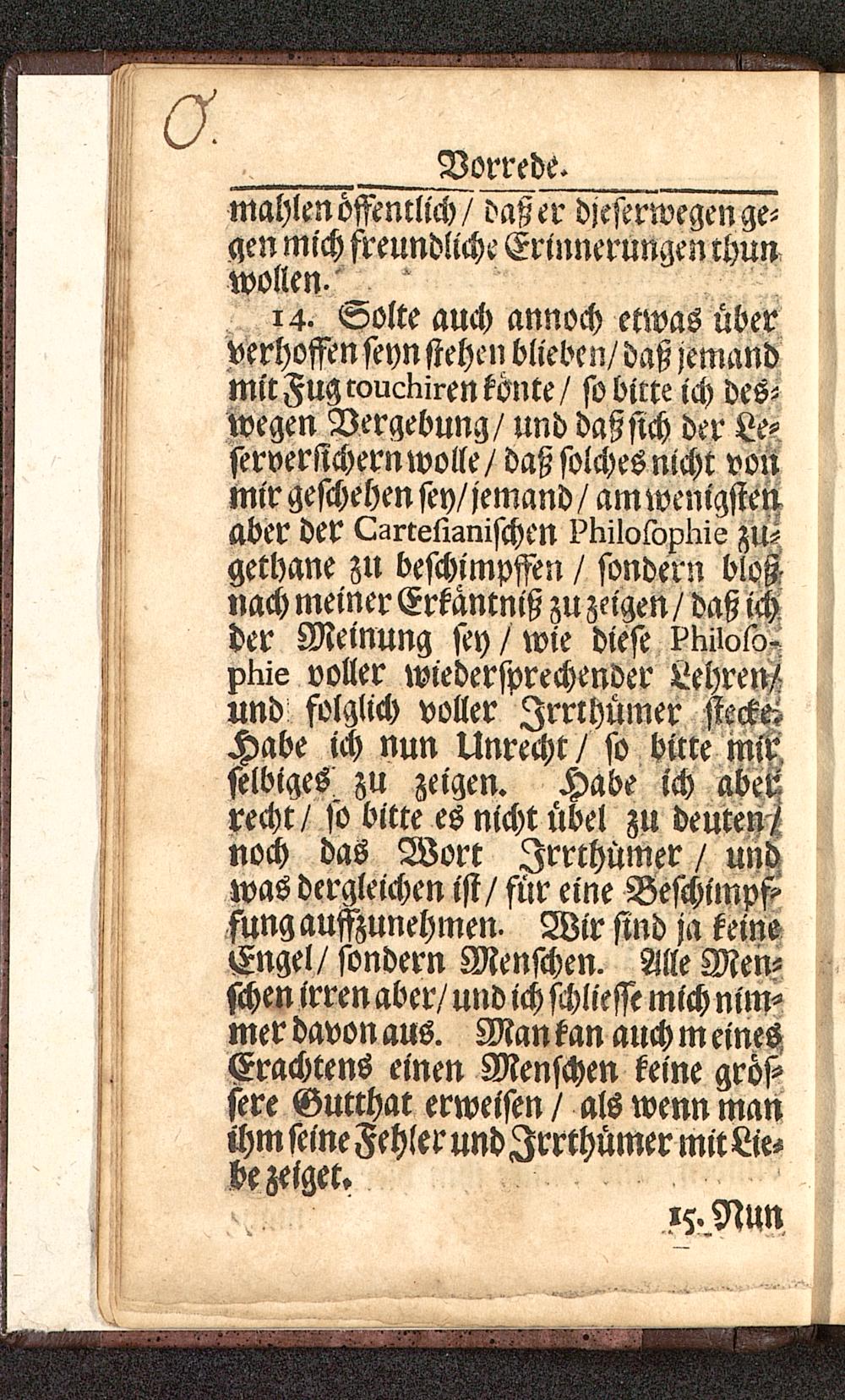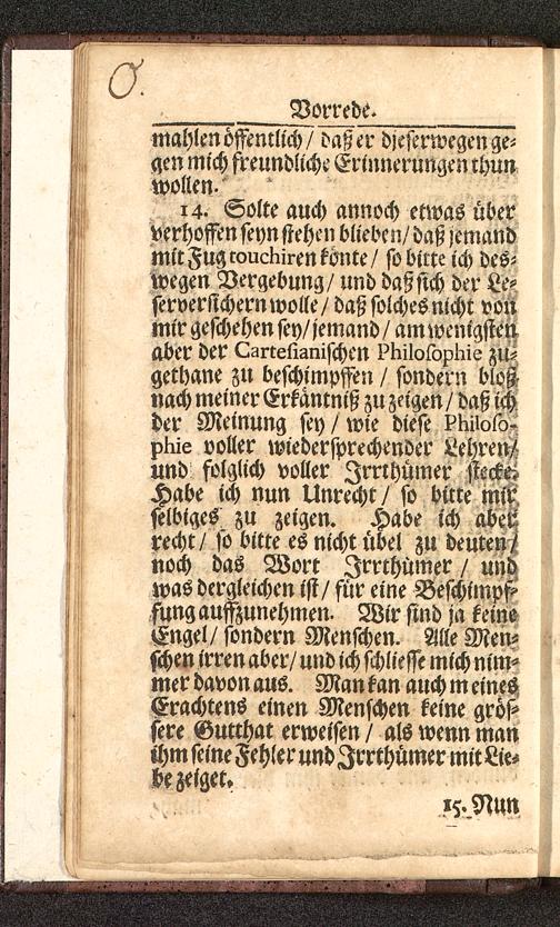 14. volte auch annoch etwas überverhoffen seyn stehen blieben/ daß jemandmit Fug coucKiren tönte / so bitte ich des-wegen Vergebung/ und daßsich der Le-serverstchern wolle/ daß solches nicht vonmir geschehen sey/jemand / am wenigstenaber der Lartelisnischen ?Kil0lopKis zu-gethane zu beschimpften / sondern bloß-nach meiner Erkantniß zu zeigen / daß ichder Meinung sey/ wie diese ?Kiw5o-plüe voller wiedersprechender Lehren/und folglich voller Irrthümer stecktHabe ich nun Unrecht/ so bitte mitselbiges zu zeigen. Habe ich aberrecht/ so bitte es nicht übel zu deutendnoch das Wort Irrthümer / undwas dergleichen ist / für eine Beschimpftfung aufzunehmen. Wir sind ja keineEngel/ sondern Menschen. Alle Men-schen irren aber/ und ich Messe mich nim-mer davon aus. Man tan auch m einesErachtens einen Menschen keine grös-sere Gutthat erweisen / als wenn manihm seine Fehler und Irrthümer mit Lie-be zeiget.