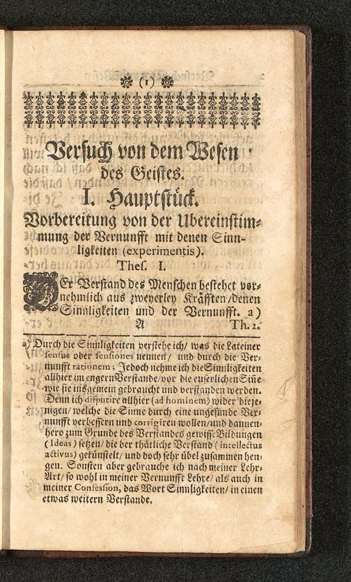 «) Durch die Siiniligkciten verstehe ich/ was die Lateiner^' st!i,su« oder t^usiones nennen/ lind durch die Ver-nunfft I^ci'.nem; Jedoch nehme ich dieSinnligkeitenallhier im engcrnVerstande/vor die cuserlichcnLinewie sie insgemein gebraucht und verstanden werden.' Denn ich Ü!fpucire ttllhier(a!j Komiuem) wider dieze») nigcn/ welche die Sinne durch eine ungesunde Ver-^ nunfft verbessern und cc» li^iren wollen/und danncn-hero zum Grunde des Verstandes gewisscBiloungen,(i^euz) setzen/ die der thätliche Verstand (incelleÄuzattivus) gekünstelt/ und doch sehr übel zusammen hen-gcn. Sonstcn aber gebrauche ich nach meiner Lehr-Art/ so wohl in meiner Vernunfft Lehre/ als auch inmeiner cvntezllvn, das Wort Sinnligkcitcn/ in einenetwas weitem Verstände.