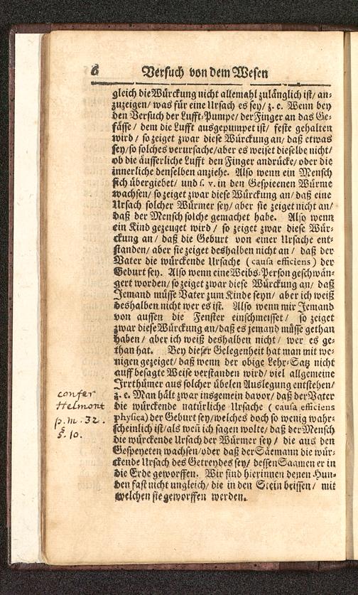 gleich dieWürckung nicht allemahl zulänglich ist/ an-zuzeigen/was für eine Ursach essey/z. e. Wenn beyden Versuch der Lufft-Pumpe/ derFingcr an das Ge-fasst/ demoieLuffc ausgepumpet ist/ feste gehaltenwird / sozciget zwar diese Würckungan/ daß etwassey/so solches verurfachc/aber es weiset dieselbe nicht/«ob die ausserliche Lufft den Finger andrücke/ oder dieinnerliche denselben anziehe. Also wenn ein Menschfich überziehet/ und 5. v. in den Gespieenen Wurme»vachsen/so zeiget zwar diese Würckung an/daß eineNrsach solcher Würmer sey/aber sie zeiget nicht an/daß der Mensch solche gemachet habe. Also wennein Kind gezeuget wird / so zeiget zwar diese Wür-rkung an / daß die Geburt von «ner Ursache ent-standen/ aber sie zeiget dcshalben nicht an / daß derVater die würckcnde Ursache (cs,u5a etKcie-,5) derGeburt sey. Also wenn cineWcibs-Person gcschwän-Acrt worden/so zeiget zwar diese Würckungan/ daßJemand müsse Vater zum Kinde seyn/ aber ich weißdeshalben nicht wer es ist. Also wenn wir Jemandvon aussen die Fenster einschnmsset/ so zeigetzwar dieseWürckung an/daß es jemand müsse gethanhaben / aber ich weiß deshalben nicht/ wer es ge-thanhat. Bey dieser Gelegenheit hat man mit wc-Hngen gezeiget/daß wenn der obige Lehr-Say nicht«uffbesagteWeise verstanden wird/viel allgemeineIrrthümer aus solcher übelen Auslegung entstehen/c^>i^ei' e. Man halt zwar insgemein davor/ daß derVatcr//e/^-n^ die würckende natürliche llrjache (causa eKci>-us/? )/-.. 3 . der Geburt sey/welches doch so wenig wayr-