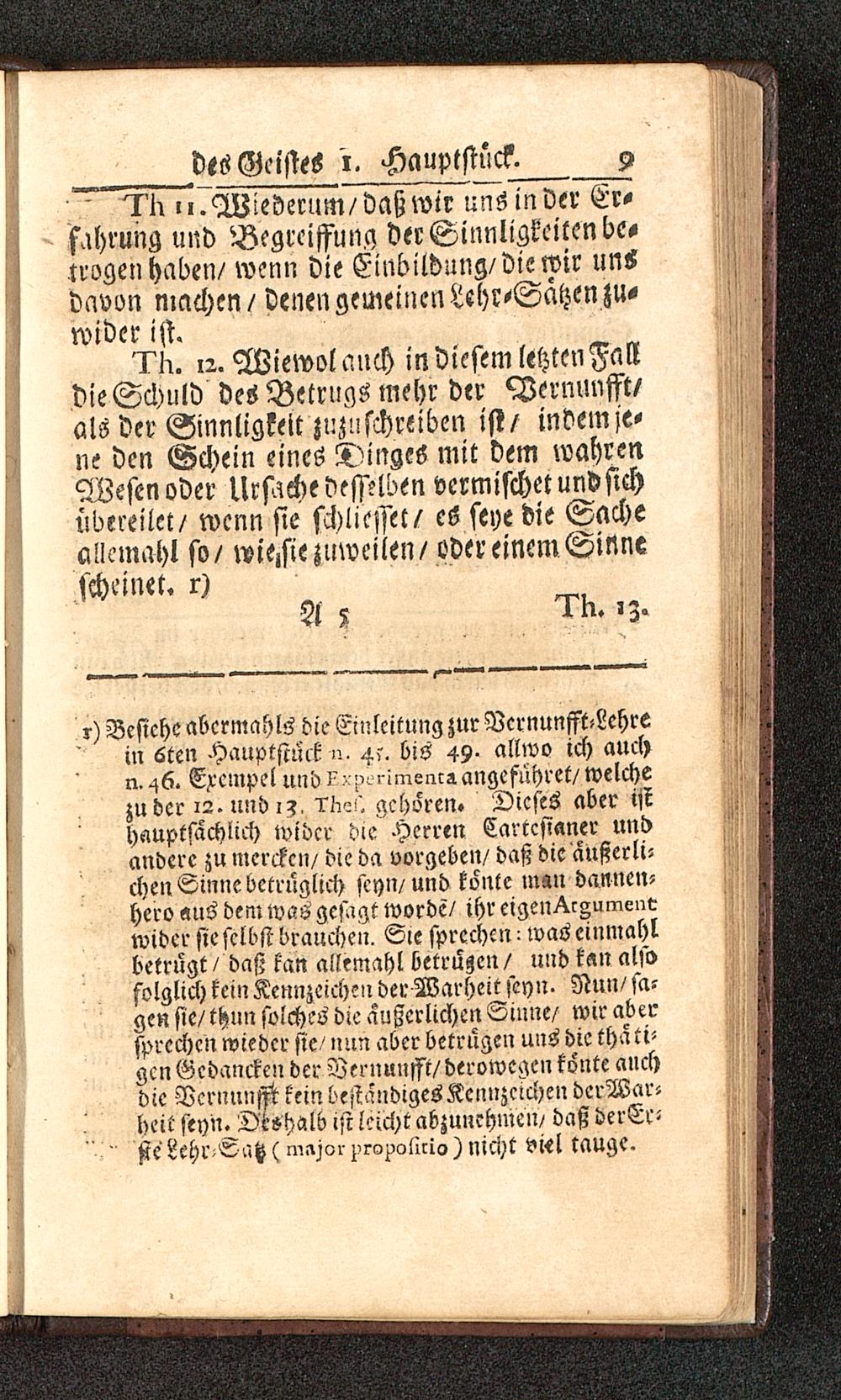 r) Besiehe abcrmahls die Einleitung zur Vcrnunfft-Lehrein <5ten Hauptstück 4s. bis 49. allivo ich auchn.46. Exempel und ^>!'crimenr-t angeführet/welchezu der 12. und i?, gehören. Dieses aber isthauptsächlich wider die Herren Cartcsianer undandere zu mcrckcn/ die da vorgeben/ daß die äußerli-chen Sinne betrüglich seyn/ und tonte insu dannen-hero aus dem was gesagt worde/ ihr eigen^Aumenewider sie selbst brauchen^ Sie sprechen nvas einmahlbetrügt / daß kan allemahl betrügen/ und tan alsofolglich kein Kennzeichen der Warheit seyn. Nun/ sa?gen sie/thun solches die äußerlichen Sinne/ wir abersprechen wieder sie/ nun aber betrügen uns die tha ei-gen Gcdanckcn der Vernunfft/derowcgen tönte auchdie Vcrnunffr kein beständiges Kennzeichen derWar-heil seyn. Deshalb ist leicht abzunehmen/ daß oerEr-