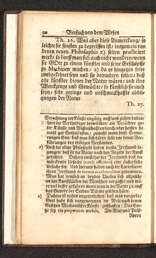 Man hat nemlich an beyden Theilen sich allzusehran den Kunststücken der Menschen vergaffet/und Wa-re viel besser gefahren wenn man in derNatur zeaussdas Gewebe der Seiden-Wurme gesehen hatte.2) Dahero ist nichts ungcwnliches/ daß man vorgicbt/Gott habe sich vorgenommen die Welt nach denenGesetzen McchanischerKünsie / znschaffcn: DasHcr-tze sey einxer^stuum mobile. IjcVlutundPulß-