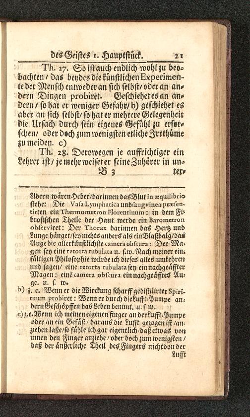 l'K. 27. So ist auch endlich wohl zu beo-bachten/ das beydes die künstlichen Lxperimen-te der Mensch entweder an sich selbst/ oder an an-dern Dingen probiret. Geschiehet es an an-dern/ so hat er weniger Gefahr/b) geschiehet esaber an sich selbst/so hat er mehrere Gelegenheitdie Ursach durch sein eigenes Gefühl zu erfor-schen/ oder d»ch zum wenigsten etliche Irrthumezu meiden, c)