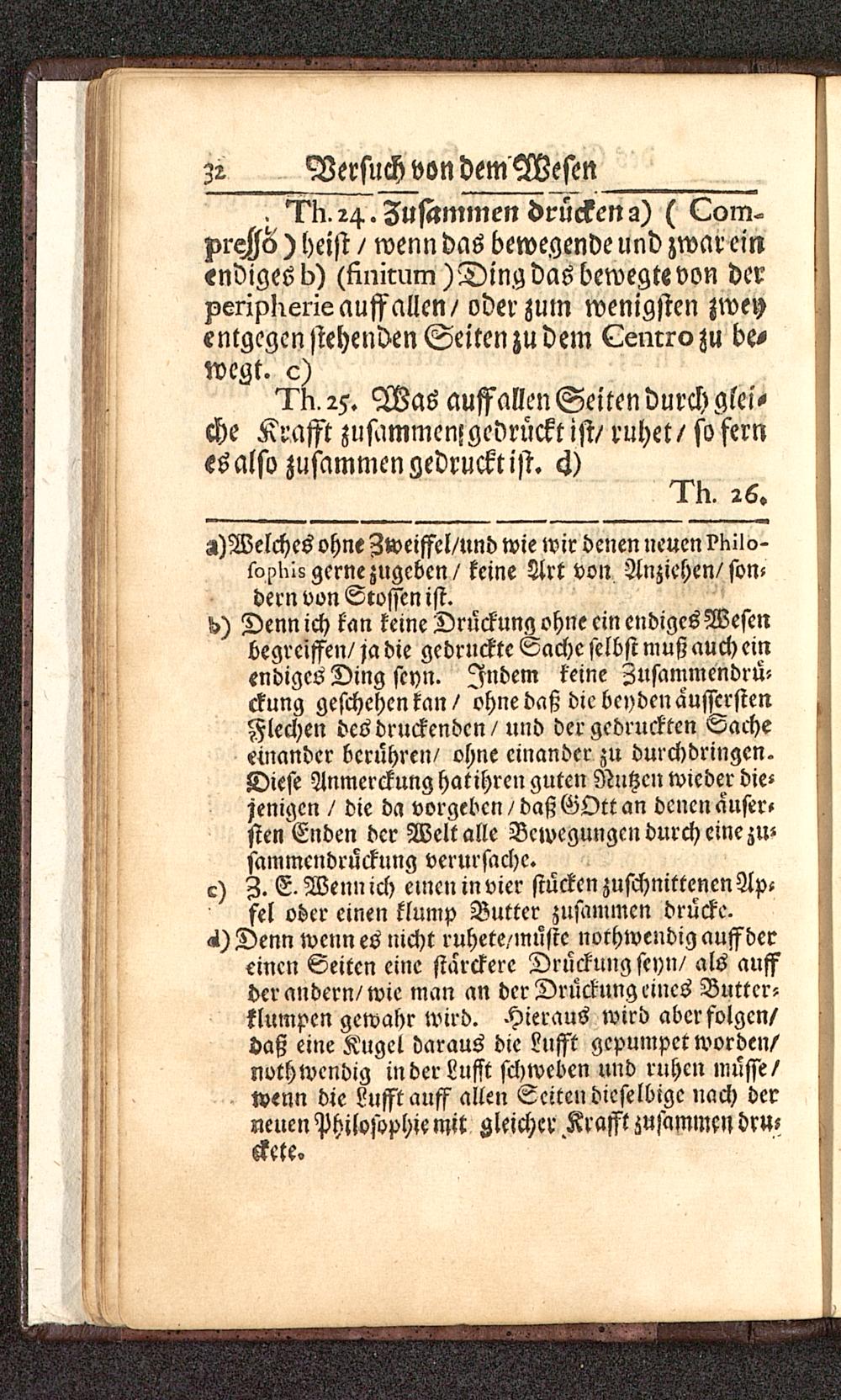 i>) Denn ich kan keine Drückung ohne ein cndigcsWesenbegreiffen/ ja die gedruckte Sache selbst muß auch einendiges Ding seyn. Indem keine Zusammendrü-ckung geschehen kan / "ohne daß die beyden äusserstenFlechen des druckenden/und der gedruckten Sacheeinander berühren/ ohne einander zu durchdringcn.Diese Anmerckung hatihren guten Nutzen wieder die-jenigen / die da vorgeben/daßGOltan denen äuser,sten Enden der Welt alle Bewegungen durch eine zu-sammcndrückung verursache.