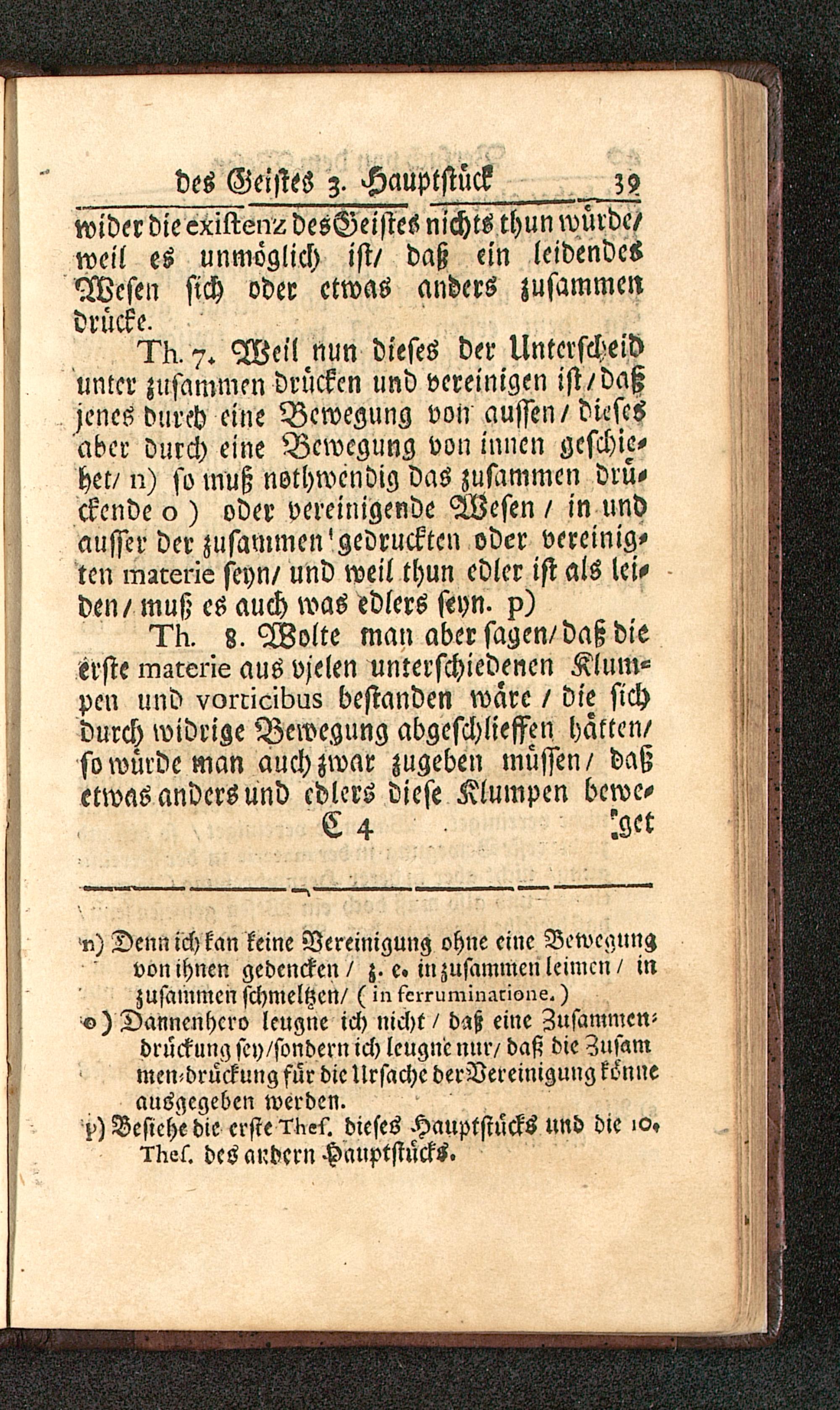 I'K.?. Weil nun dieses der Unterscheidunter zusammen drücken und vereinigen ist/daßjenes durch eine Bewegung von aussen/ diesesaber durch eine Bewegung von innen geschie-het/ n) so muß nothwendig das zusammen drü-ckende « ) oder vereinigende Wesen / in undausser der zusammen'gedruckten oder vereinig-ten maceris seyn/ und weil thun edler ist als lei-den/muß es auch was edlers seyn, p)