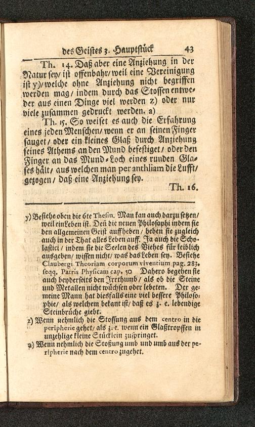 15. >4. Daß aber eine Anziehung in derNatur sey/ist offenbahr/weil eine Vereinigungist/)/welche ohne Anziehung nicht begriffenwerden mag/ indem durch das Stössen entwe-der aus einen Dinge viel werden 2) oder nurviele zusammen gedruckt werden, z)