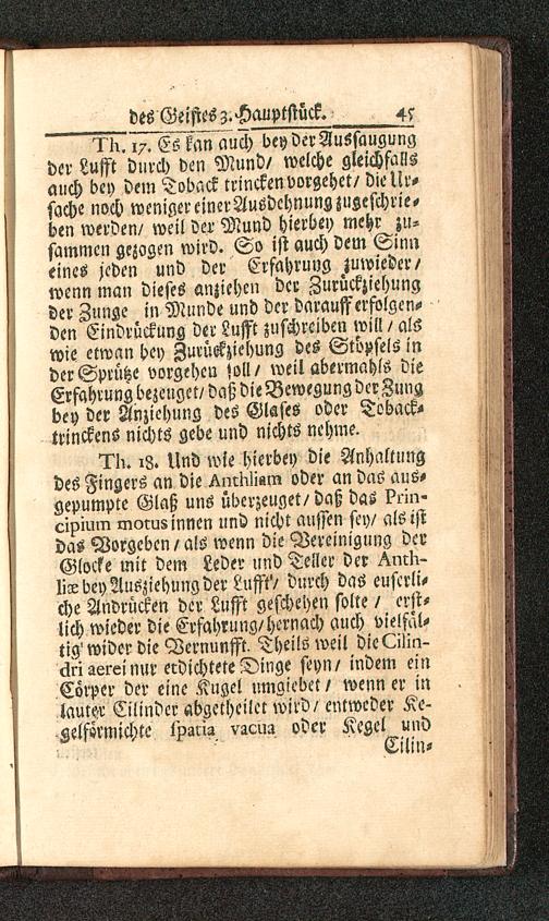 1A. 17. Es kan auch beyderAuSsaugungder Lufft durch den Mund/ welche gleichfallsauch bey dem Toback trincken vorgehet/ die Ur-sache noch weniger einerAusdehnungzugeschrie-den werden/ weil der Mund hierbei) mehr zu-sammen gezogen wird. So ist auch dem Sinneines jeden und der Erfahrung zuwieder/wenn man dieses anziehen der Zurückziehungder Zunge in Munde und der daraufferfolgcn-den Eindrückung der Lufft zuschreiben will / alswie etwan bey Zurückziehung des Stöpsels inder Sprühe vorgehen joll/ weil abermahls dieErfahrung bezeuget/daß die Bewegung der Zungbey der Anziehung des Glases oder Toback-trinckens nichts gebe und nichts nehme.