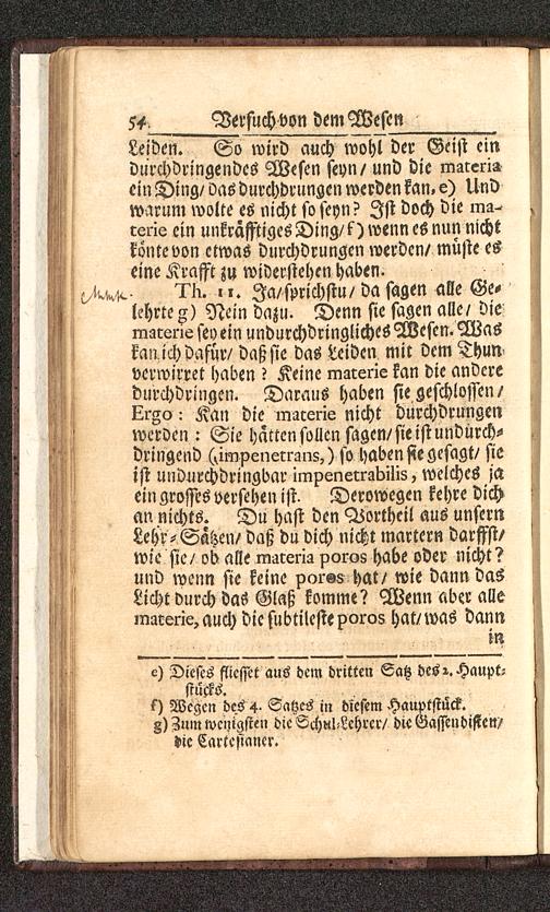 Leiden. So wird auch wohl der Geist eindurchdringendes Wesen seyn / und die marcri»ein Ding/ oas durchdrungen werden kan. e) Undwarum wolle es nicht so seyn? Ist doch die ma^csrie ein unkräfftigesDing/f) wenn es nun nichttönte von etwas durchdrungen werden/ müste eseine Krafft zu widerstehen haben.