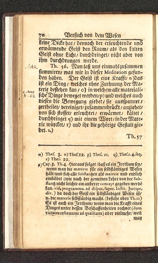keine Dicke hat/ dennoch der erleuchtende underwärmende Geist den Raum/ als den kaltenGeist ohne Licht/ durchdringet/ nicht aber vonihm durchdrungen werde.,5^. 1K. ;6. Nun laß uns einmahl zusammensummiren/ was wir in dieser Klcäitsuon gefun-den haben. Der Geist ist eine Krafft/ n)da6ist ein Ding/ welches ohne Zuthuung derMa-bestehen kan / o) in welchem alle materiali-> > 4-. sche^Dinge beweget werden/p) und welches auchdiesen die Bewegung giebet/sie ausspannet/zertheilet/ vereiniget/^usamnicndrückt/anziehet/von sich stosset/erleuchtet/ erwärmet/ kaltet/durchdringet^) mit einem Wort/inderMate-rie würcket/ r) und ihr die gehörige Gestalt gie-bst. 5.)