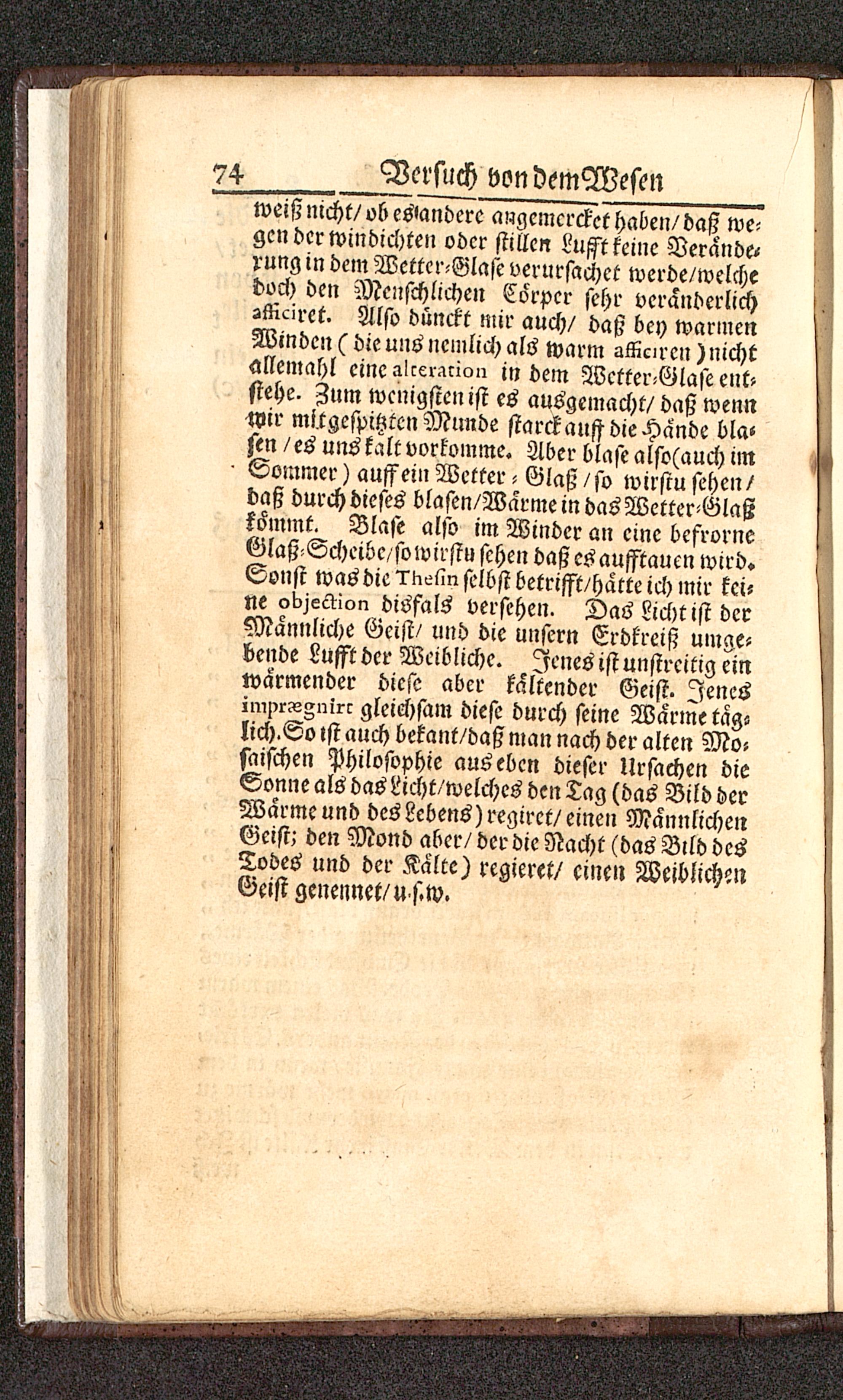 weiß nicht/ ob es'andcrc augcmcrcket haben/daß we-gcn dcrwindichten oder stillen Lufft keine Verände«rung in dem Wetter-Glase verursachet werde/welchedoch den Menschlichen Corpcr sehr veränderlich-Kcirct. Also dünckt mir auch/ daß bey warmenWinden (die uns iicmlich als warm -iKcircn) nichtallemahl eineaicc^rion indem Wetter-Glase ent-stehe. Zum wenigsten ist es ausgemacht/daß wennNir mitgcspitztcn Munde starck anst die Hände bla-sen/es unstet vorkomme. Aber blase also(aucl) im^ Sommer) auffei» Wetter - Glaß / so wirstu sehen/daß durch dieses blasen/Warme in das Wetter-Glaßkömint. Blase also im Minder an eine bcfrorneGlaß-Scheibc/sowirstu sehen daß esaufftaucnwird.Sonst was die °rii--^n selbst betrifft/hatte ich mir kei-ne objection disfals verschen. Das Licht ist derMannliche Geist/ und die unsern Erdkreiß umge-bende Lufftdcr Weibliche. Jenes ist unstreitig einwärmender diese aber kaltender Geist. Jenesimprssznirc gleichsam diese durch seine Warme tag-lich.So «st auch bekant/daß man nach der alten Mo-saischen Philosophie aus eben dieser Ursachen dieSonne als das Licht/welches den Tag (das Bild derWarme und des Lebens) regirct/einen MännlichenGeist; den Mond aber/ der die Nacht (das Bild desTodes und der Kalte) regieret/ einen WeiblichenGeist genennet/U's.w.