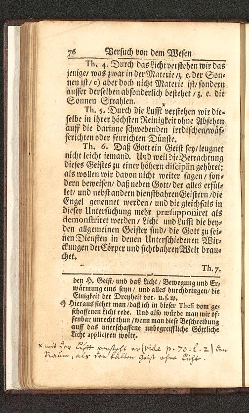 Hi. 6. Daß Gott ein Geist sey/leugnetnicht leicht iemand. U'^d weil dieBetrachtungdieses Geistes zu einer hohernciilciplin gehöret:als wollen wir davon nicht weiter sagen/son-dern beweisen/ daß neben Gott/der alles erfül-let/ und nebstandern dienstbahrenGeistern/dieEngel genennct werden/und die gleichstes indieser Untersuchung mehr pi-T5upponiret alsciemonttnret werden / Licht und Lufft die bey-den allgemeinen Geister sind/ die Gott znsei-ncnDiensten in denen Unterschiedenen Wir-kungen dcrCörpcr und sichtbahrenWelt brau-chet.