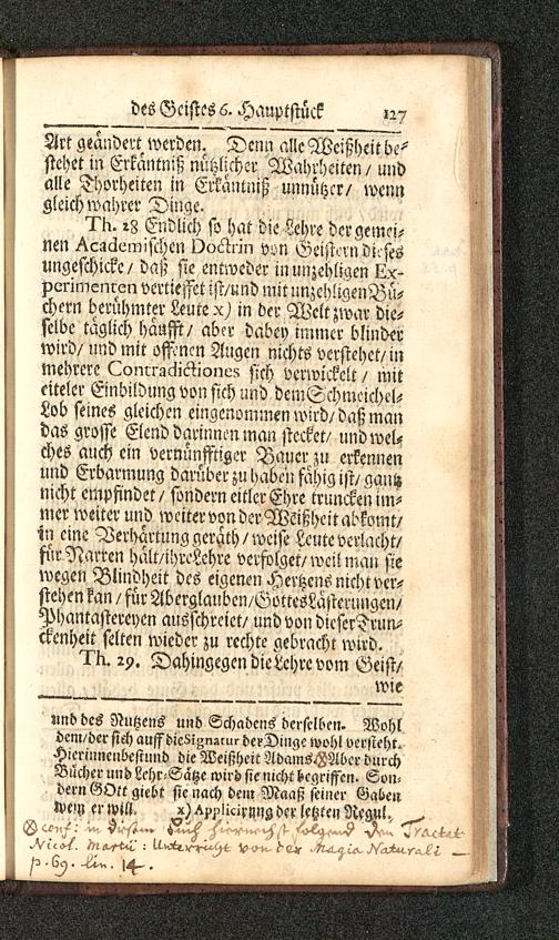 I'K. !8 Endlich so hat die Lehre der gemei-nen ^caäemischcn !)»6i>iii von Geisten diesesUngeschicke / daß sie entweder inunzehligen I^x-pcrimenren verliesset ist/und mit unzehligenBü-chern berühmter Leutex) in der Welt zwar die-selbe täglich häufst/ aber dabey immer blinderwird/ und mit offenen Augen nichts verstehet/inmebrere Lonn-g-Mion^ sich verwickelt / mitciteler Einbildung von sich und dcmSchmeichel--Lob seines gleichen eingenommen wird/daß mandas grosse Elend darinnen man stecket/ und wel-ches auch ein vernünfftiger Bauer zu erkennenund Erbarmung darüber zu haben fähig ist/ gantznicht empfindet / sondern eitler Ehre truncken im-mer weiter und weiter von der Wsißheit abkomt/in eine Verhärtung geräth/weise Leute verlacht/für Narren halt/ihreLehre verfolget/weil man siewegen Blindheit des eigenen Hertzens nicht ver-stehen kan / für Aberglauben/GottesLasterungen/Phantastereyen ausschrciet/ undvondieserTrun-Äenheit selten wieder zu rechte gebracht wird.