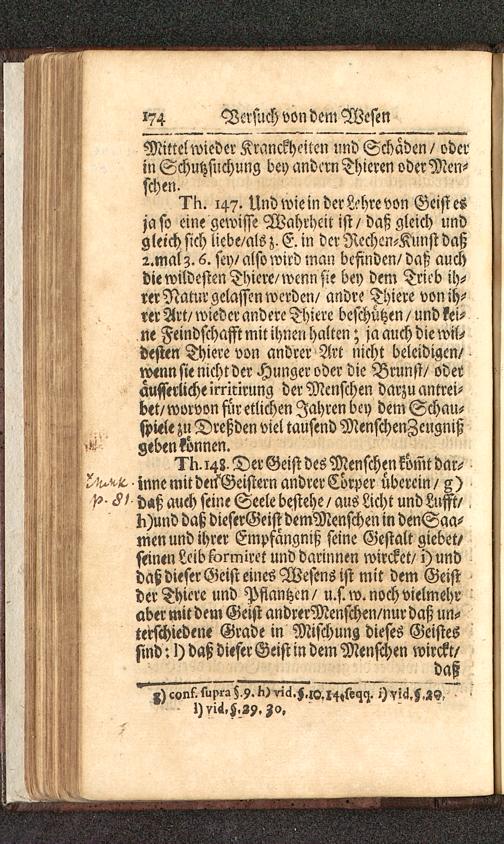 I'K. 148- Der Geist des Menschen kömt dar-5 - jnne mit del^Geisiern andrer Cörper überein / Z )^ daß auch seine Seele bestehe / aus Licht und Lufft/.K)und daß dieserGeist demMenschen in denSaa-men und ihrer Empfängniß seine Gestalt giebst/seinen Leib formiret und darinnen wircket/ i) unddaß dieser Geist eines Wesens ist mit dem Geistder Thiere und Pflantzen/ u.s.w. noch vielmehraber mit dem Geist andrerMensclM/nur daß un-terschiedene Grade in Mischung dieses Geistessind: I) daß dieser Geist in dem Mensthen wirckt/^____^ daß