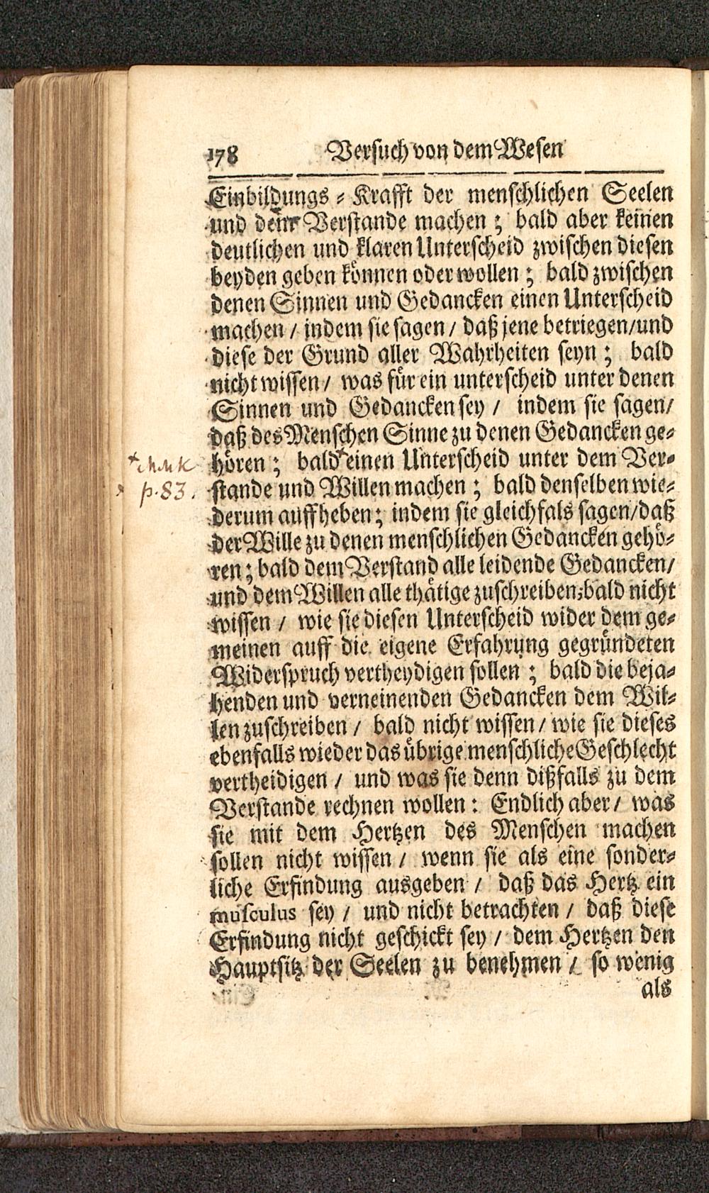Finbildungs -- Krafft der menschlichen Seelen-und den?Berstande machen ; bald aber keinendeutlichen und klaren Unterscheid zwischen diesenbeyden geben können oder wollen; bald zwischendenen Sinnen und Gedancken einen Unterscheidmachen / indem sie sagen / daß jene betriegen/und-diese der Grund aller Wahrheiten seyn; baldNichtwissen / was für ein unterscheid unter denenSinnen und Gedancken sey / indem sie sagen/daß desMenschcn Sinne zu denen Gedancken ge-^K^/^ hören; balMnen Unterscheid unter dem Ver-^ /- 53. siqnde und Willen machen; bald denselben wie-derum aUffheben; indem sie glcichfals sagen/daßcherWille zu denen menschlichen Gedancken gehö-ren ; bald demBerftand alle leidende Gedanckm/.und demWillen alle thatige zllschreiben-bald nichtMissen / wie sie diesen Unterscheid wider dem ge-meinen auff die. eigene Erfahrung gegründetenMiderspruch vertheydigen sollen ; bald die beja-henden und verneinenden Gedancken dem Wil-len zuschreiben / bald nicht wissen/ wie sie diesesebenfalls wieder das übrige menschlicheGeschlechtvertheidigen / und was sie denn dißfalls zu demVerstände rechnen wollen: Endlich aber/ wassie mit dem Hertzen des Menschen machensollen nicht wissen / wenn sie als eine sonder-liche Erfindung ausgeben / daß das Hertz- einpwlculus sey / und nicht betrachten / daß dieseErfindung nicht geschickt sey / dem Hertzen denHauptschd^r Seelen zu benehnien/. sowenig