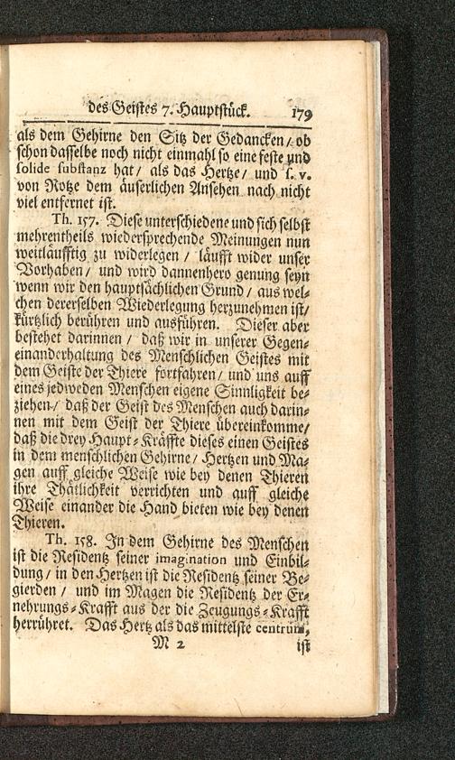 l'K. 157. Diese unterschiedene und sich selbstmehrentheils wiedersprechcnde Meinungen nunweitlaufftig zu widerlegen / läufft wider unserVorhaben/ und wird dannenhero genung seynwenn wir den hauptsächlichen Grund / aus wel-chen dererselben Wiedcrlegung herzunehmen ist/kürtzlich berühren und ausführen. Dieser aberbestehet darinnen / daß wir in unserer Gegen-einanderhaltung des Menschlichen Geistes mitdem Geiste der Thiere fortfahren/ und uns auffeines jedweden Menschen eigene Smnligkeit be-ziehen/ daß der Geist des Menschen auch darin-nen mit dem Geist der Thiere übereinkomme/daß die drey Haupt-Kräffte dieses einen Geistesin dem menschlichen Gehirne / Hertzen und Ma-gen auff gleiche Weise wie bey denen Thierenihre Thätlichkeit verrichten und auff gleicheWeise einander die Hand bieten wie bey denenThieren.