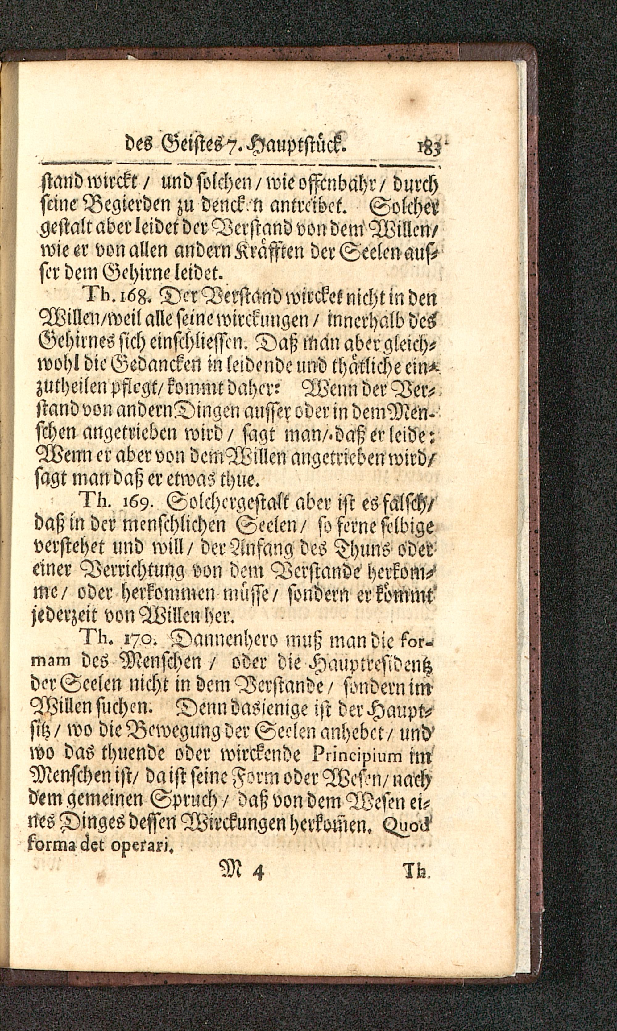 I'K. 170. Dannenhero muß man die K>r-mzm des Menschen / oder die Hauplresidentzder Seelen nicht in dem Verstände/ si'Ndernim-Willen suchen. Denn dasjenige ist der Haupt-sitz/ wo die Bewegung der Seelen anhebet / und'wo das thuende oder wirckende ?,incipium imMenschen ist/ da ist seine Form oder Weftn/ nachdem gemeinen Spruch / daß von dem Wesen ei-nes Dinges dessen Wirckungen heMnen. Hu^'