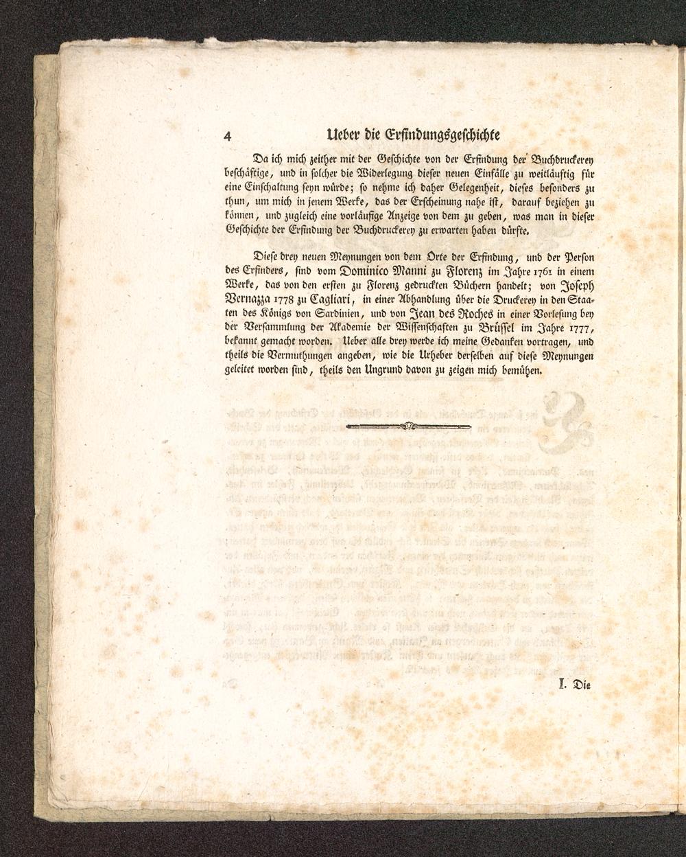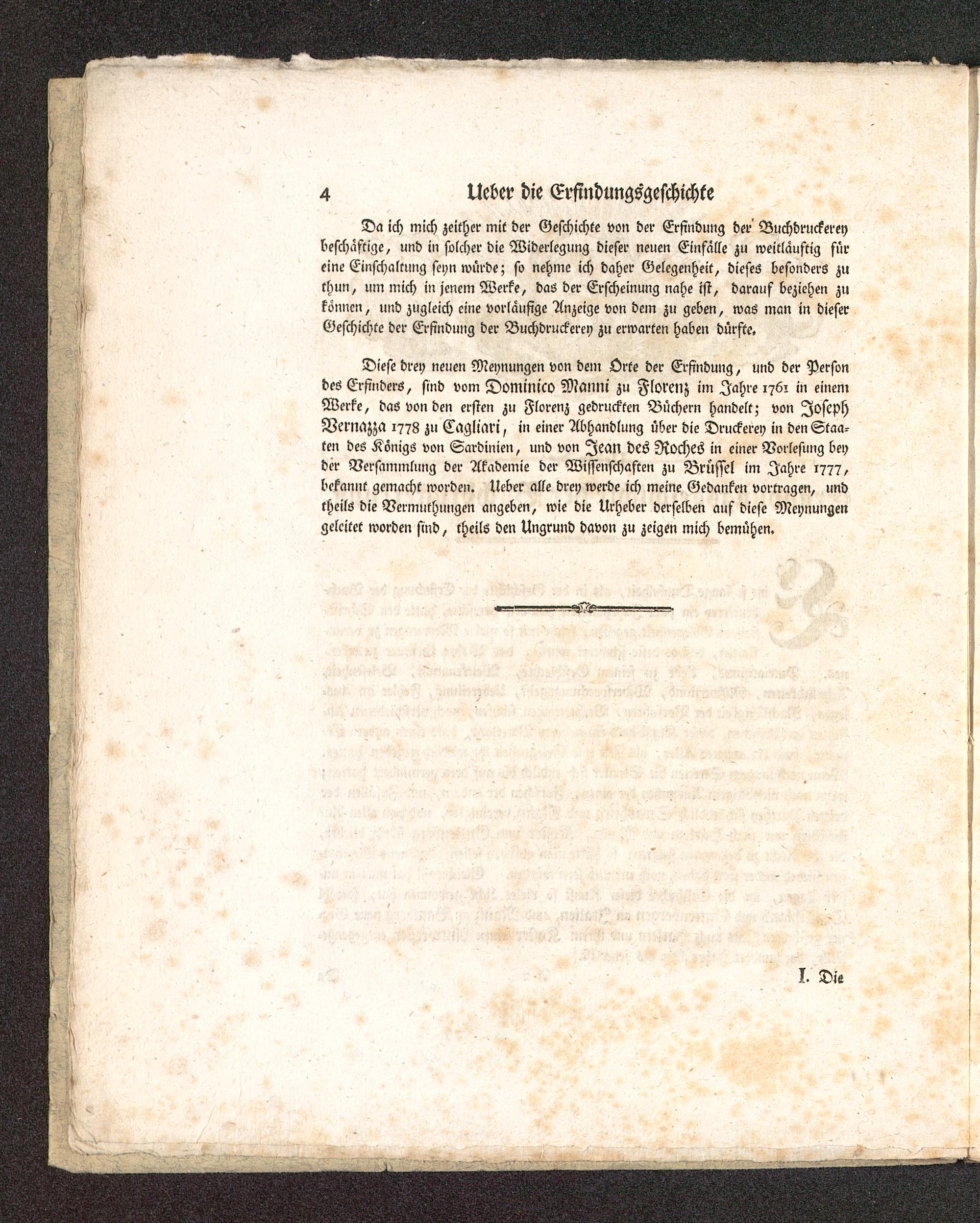 Diese drey neuen Meynungen von dein Orte der Erfindung, und der Persondes Erfinders, sind vom Dominico Maimi zu Florenz im Jahre 176: in einemWerke, das von den ersten zu Florenz gedruckten Büchern handelt; von JosephVemazza 1778 zu Caglmri, in einer Abhandlung über die Druckerei) in den Staa-ten des Königs von Sardinien , und von Jean des Roches in einer Vorlesung beyder Versammlung der Akademie der Wissenschaften zu Brüssel im Jahre 1777,bekannt gemacht worden. Ueber alle drey werde ich meine Gedanken vortragen, undtheils die Vermuthungen angeben, wie die Urheber derselben auf diese Meynungengeleitet worden sind, theils den Ungrund davon zu zeigen mich bemühen.
