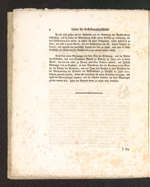 Da ich mich zeither mit der Geschichte von der Erfindung der Buchdruckern)beschäftige, und in solcher die Widerlegung dieser neuen Einfälle zu weitläuftig füreine Einschaltung seyn würde; so nehme ich daher Gelegenheit, dieses besonders zuthun, um mich in jenem Werke, das der Erscheinung nahe ist, darauf beziehen zutonnen, und zugleich eine vorläufige Anzeige von dem zu geben, was man in dieserGeschichte der Erfindung der Buchdruckerey zu erwarten haben dürfte.