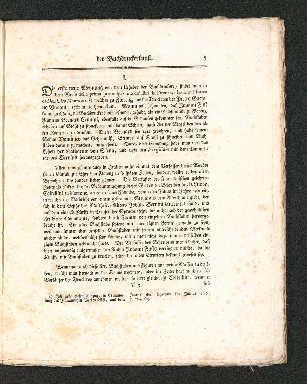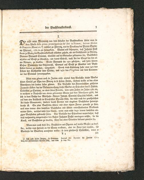 6^ie erste neue Meynung von dem Urheber der Buchdruckerey findet man m«^»^ dein Werke ^rima ^iomul^3/ione 6e'^iidri in?iieu/.e, le/ione ilrorica6i Oo?«W/5t)7l5K,!»i^c.2) welches zu Florenz ^ aus der Druckerei) des Pictro Gaeta-no Viviani, I?6l in 4to herauskam. Manni will behaupten, daß Johann Fust kaum zu Mainz die Buchdruckerkunst erfunden gehabt, als ein Goldschmidt zu Florenz ,Namens Bernard Cenninl, ebenfalls auf die Gedanken gekommen sey, Buchstabenerhaben auf Stahl zu schneiden, um damit Schrift, nach Art der Siegel bey den al-ten Römern, zu drucken. Dieser Bernard sey 1412 gebohren, und habe seinemSohne Domilüco das Geheimniß, Stempel auf Stahl zu schneiden und Buch-staben daraus zu machen, mitgetheilt. Durch diese Erfindung habe man 1471 das