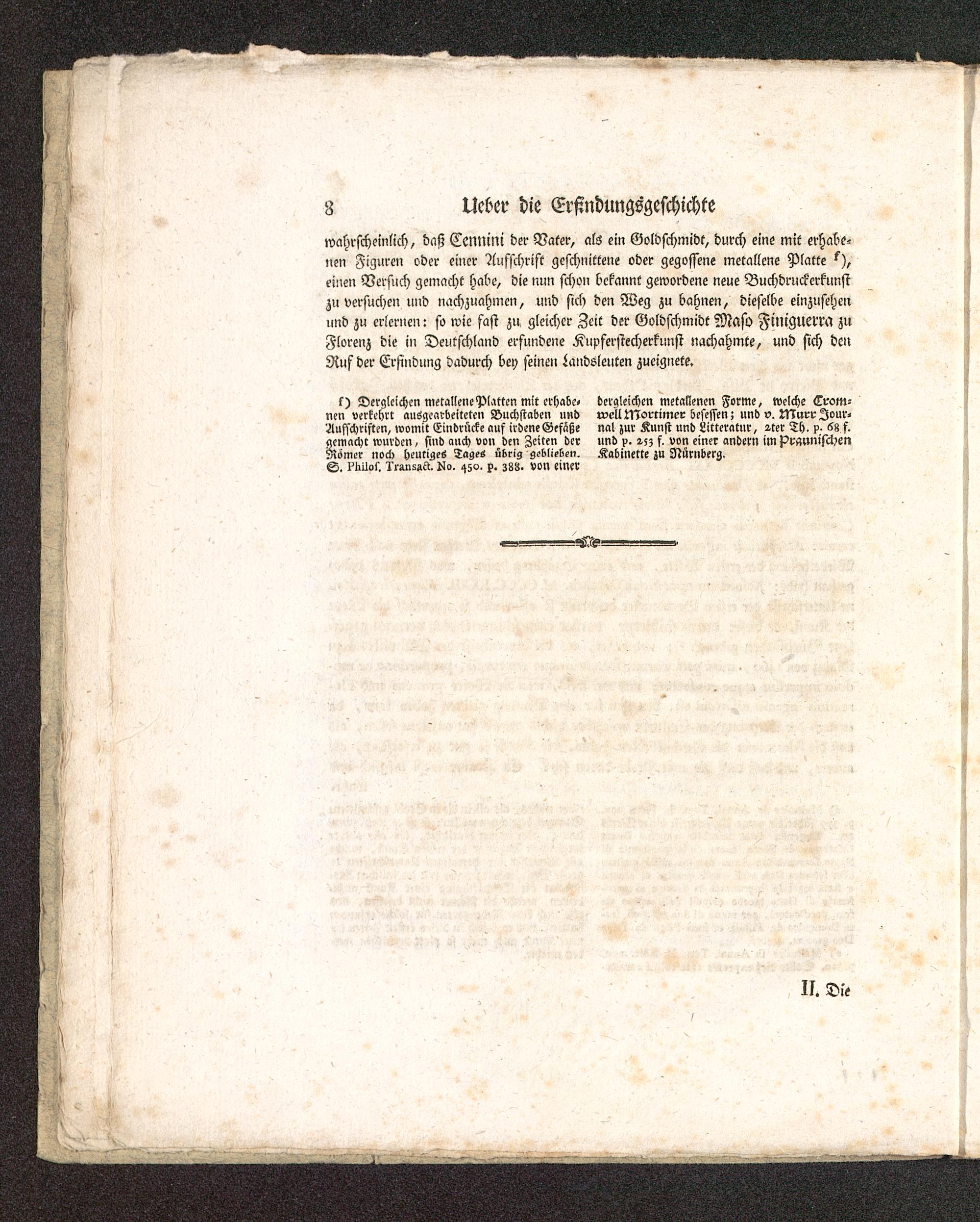 wahrscheinlich, daß Ccnnim der Vater, als ein Goldschmidt, durch eins mit erhabe-nen Figuren oder einer Ausschrist geschnittene oder gegossene metallene Platteeinen Versuch gemacht habe, die nun schon bekannt gewordene neue Buchdruckerkunstzu versuchen und nachzuahmen, und sich den Weg zu bahnen, dieselbe einzusehenund zu erlernen: so wie fast zu gleicher Zeit der Goldschmidt Maso Filtt'guerra zuFlorenz die in Deutschland erfundene Kupferstecherkunst nachahmte, und sich denRuf der Erfindung dadurch bey seinen iandsleuten zueignete.