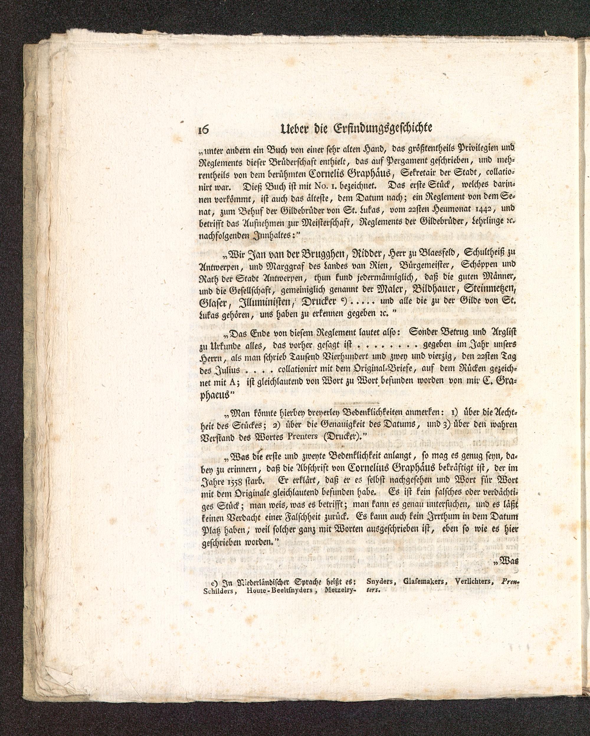 „unter andern ein Buch von einer sehr alten Hand, das größtentheils Privilegien undReglements dieser Brüderschaft enthielt, das auf Pergament geschrieben, und meh-rentheils von dem berühinten Cornelis Graphäuö, Sekretair der Stadt, collatio-nirt war. Dieß Blich ist mit Klo. i. bezeichnet. Das erste Stück, welches darin-nen vorkömmt, ist auch das älteste, dem Datum nach; ein Reglement von dem Se-nat, zum Behuf der Gildebrüder von St. iukas, vom 22sten Heumonat 1442, undbetrifft das Aufnehmen zur Meisterschaft, Reglements der Gildebrüder, Lehrlinge ?c.nachfolgenden Innhaltes:"