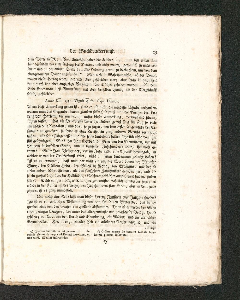 Wenn diese Anmerkung genau ist, (und es ist nicht die mindeste Ursache vorhanden,warum man das Gegentheil davon glauben sollte;) so muß man die Parthey des Lo-rcnz von Hartem, die mir selbst, außer dieser Anmerkung , verzweifelnd scheint,fahren lassen. Hat die Druckpresse dieses Hollanders gewiß Zug für Zug fo vieleunterschiedene Ausgaben, und das, fo zu sagen, von dem ersten Augenblicke der Er-findung an geliefert: so sollte eö ohne Zweifel ein ganz anderes Gerücht verursachthaben; alle seine Zeitgenossen und alle seine landsleute hatten sicherlich nicht von ihmstill geschwiegen. Wie? hat Jan Gcrbrand, Prior von den Karmelitern, der mitLamcnz in derselben Stadt, uud in demselben Jahrhunderte lebte, ihn nicht ge-kannt? Sollte Jan Veldenaer, der in, Jahr 1480 eine Chronik herausgab, inwelcher er von der Druckerkunst redet, nicht an seinen Landsmann gedacht haben?Ist es zu erwarten, daß man gar nicht ein einziges Wort davon bey NeyNt'erSnoy, bey Wlllem Heda, bey Gilles de Roya, bey Erasmus, und bey sovielen andern Schriftstellern, als das fünfzehnte Jahrhundert gegeben hat, und dieso ein großes licht über die Hollandifche Gelchrtengefchichte ausgebreitet haben, findensollte? Solch ein hartnackiges Stillschweigen müßte wahrlich wunderbar seyn; eswürde in der Finsterniß des vierzehnten Jahrhunderts statt finden, aber in dem fünf-zehnten ist es ganz unmöglich.