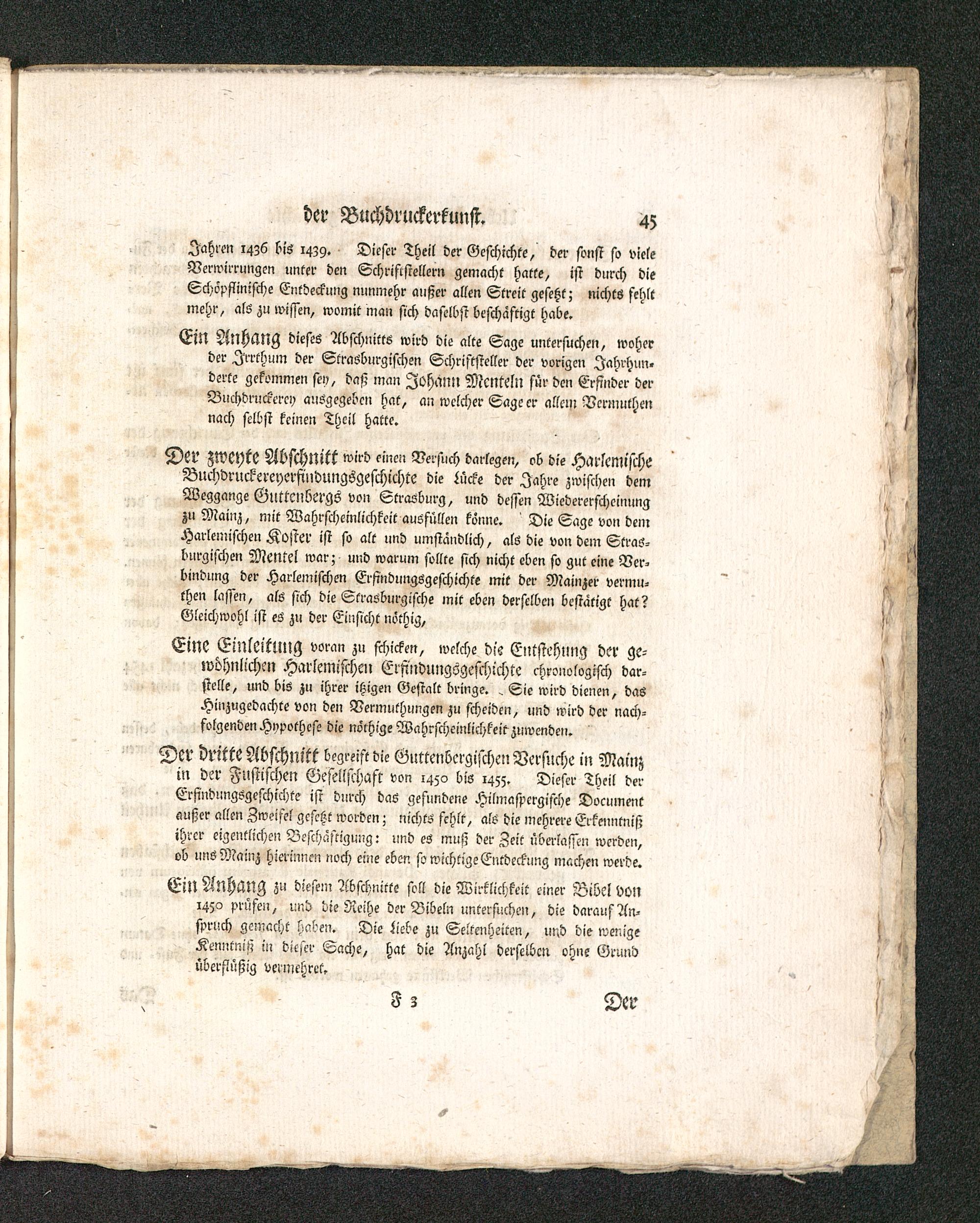 Der dritte Abschnitt begreift die Gttttenöergischen Versuche in Mainz in der Fttstischen Gesellschaft von 1450 bis 145;. Dieser Theil derErsindungsgeschichte ist durch das gesnndene Hilmaspergische Documentaußer allen Zweifel gesetzt worden; nichts schlt, als die mehrere Erkenntnißihrer eigentlichen Beschäftigung: und es muß der Zeit überlassen werden,ob uns Mainz hierinncn noch eine eben so wichtige Entdeckung machen werde.