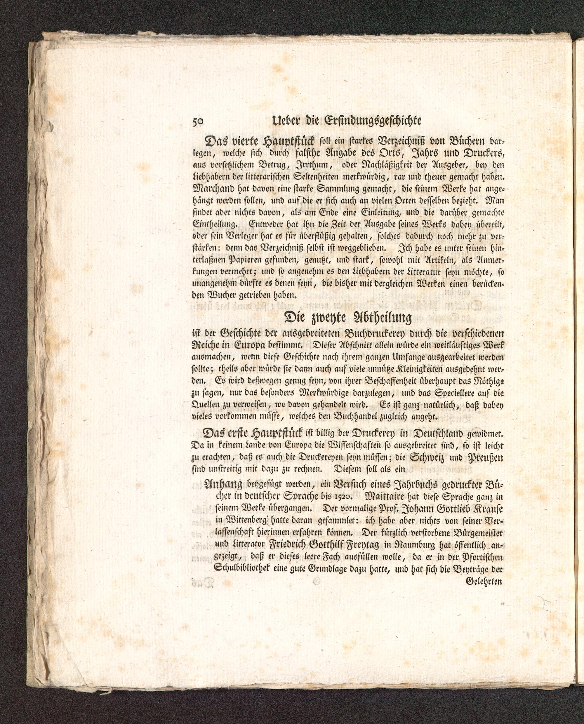 Anhang beygefügt werden, ein Versuch eines Jahrbuchs gedruckter Bü-cher in dcntscher Sprache bis 1520. Maittaire hat diese Sprache ganz inseinem Werke übergangen. Der vormalige Prof. Johann Gottlieb Krause in WittenbergZ hatte daran gesammlet: ich habe aber nichts von seiner Ver-lassenschaft hierinnen erfahren können. Der kürzlich verstorbene Bürgemeisterund Ktterator Friedrich Gotthilf Freytag in Naumburg hat öffentlich , an-gezeigt, daß er dieses leere Fach ausfüllen wolle, da er in der PfortifchmSchulbibliothek eine gute Grundlage dazu hatte, und hat sich die Beytrage der
