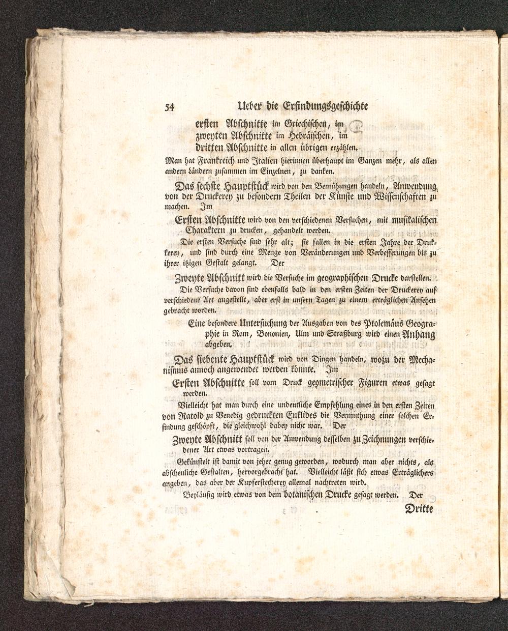 Zweyte Abschnitt wird die Versuche im geographischen Drucke darstellen.Die Versuche davon sind ebenfalls bald in den ersten Zeiten der Druckerei) aufverschiedene Art angestellt, aber erst in unsern Tagen zu einem erträglichen Ansehengebracht worden.