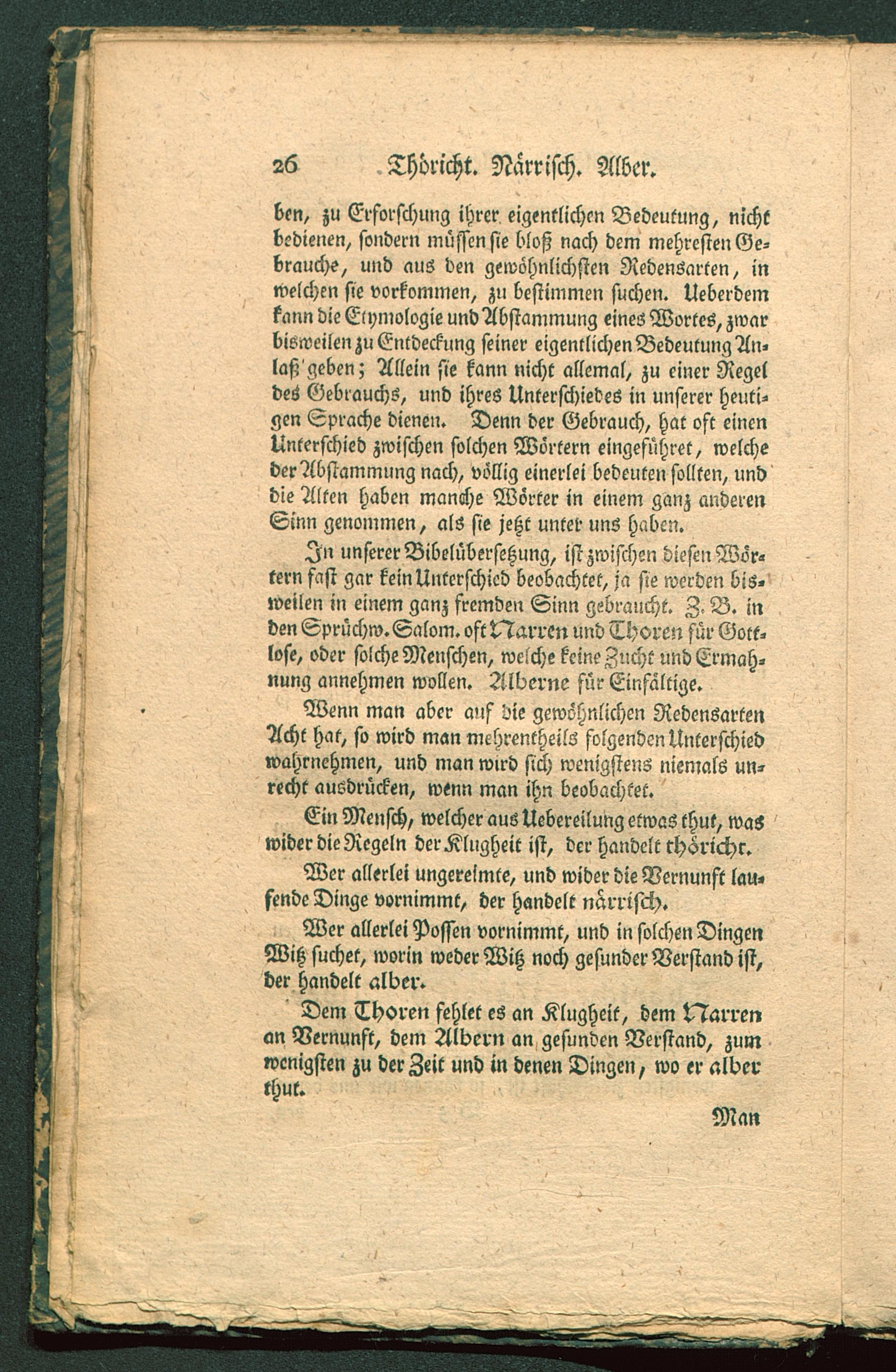 Dem Thoren fehlet es an Klugheit, dem Darrenan Vernunft, dem Albern an gefunden Verstand, zumwenigsten zu der Zeit und in denen Dingen, wo er alberthut.