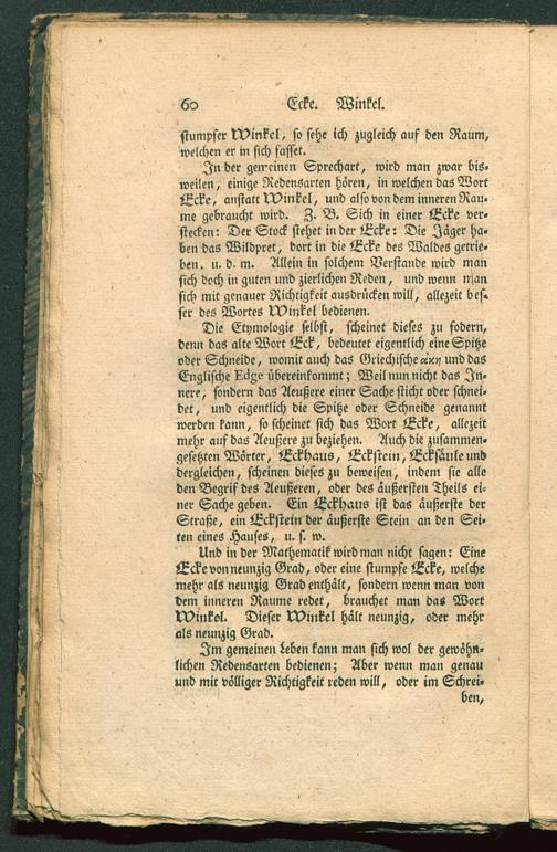 Und in der Mathematik wird man nicht sagen: EineEcke von neunzig Grad, oder eine stumpfe Ecke, welchemehr als neunzig Grad enthält, sondern wenn man vondem inneren Raume redet, brauchet man das WorttVinkol. Dieser lVinkel hält neunzig, oder mehrals neunzig Grad.
