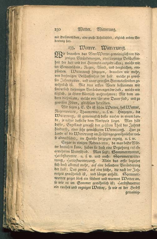 jenigen Veränderungen, oder diejenige Beschaffen-heit der Luft »nd des Himmels auszudrucken; welchewiriin Sonnenschein, Regen, Wind, und dergleichen, em-pfinden. Witterung hingegen, brauchen wir mehr,von derjenigen Beschaffenheit der Luft welche zu gewis-sen Jahreszeiten, und untergewiffenHimmeisstrichenge-wöhnlich ist. Mit dem ersten Worte bestimmen wirsonderlich diejenigen Veränderungen der Luft, welchewirtaglich, ja öfters stündlich mahrnehmen: Mit dem an-dern diej.'nizen, welche von länqerer Dauer sind, und zugewissen Zeiten, gleichsam herrschen.