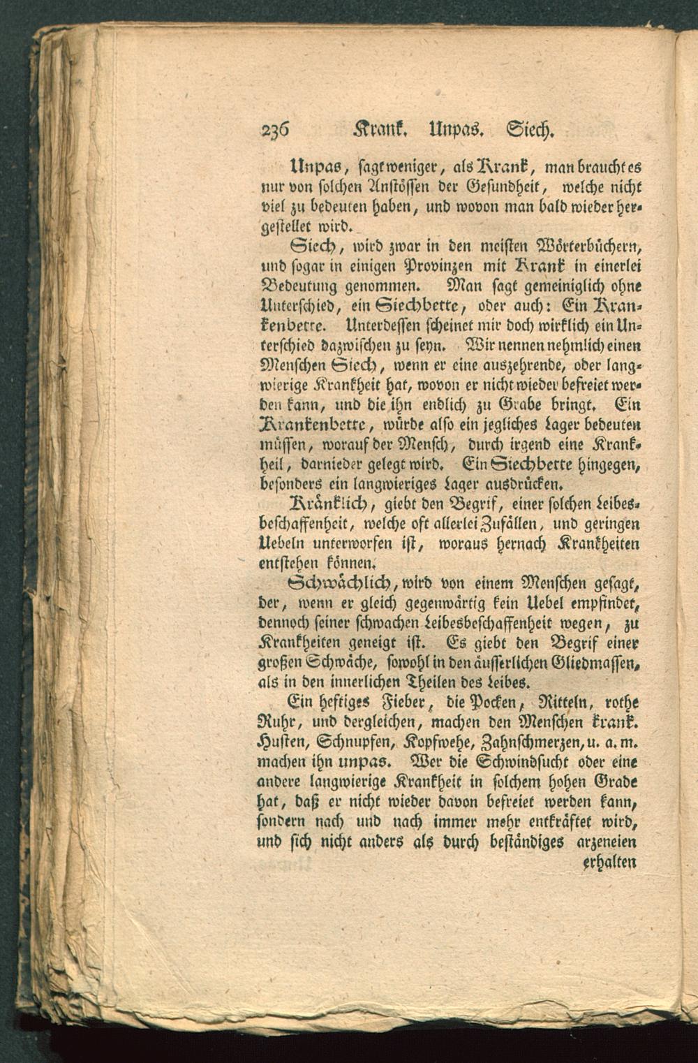 Ein heftige« Fieber, die Pocken, Nitteln, rotheRuhr, und dergleichen, machen den Menschen krank.Husten, Schnupfen, Kopfwehe, Zahnschmerzen,», a.m.machen ihn unpas. Wer die Schwindsucht oder eineandere langwierige Krankheit in solchem hohen Gradehat, daß er nicht wieder davon befreiet werden kann,sondern nach und nach immer mehr entkräftet wird,und sich nicht anders als durch beständiges arzeneien