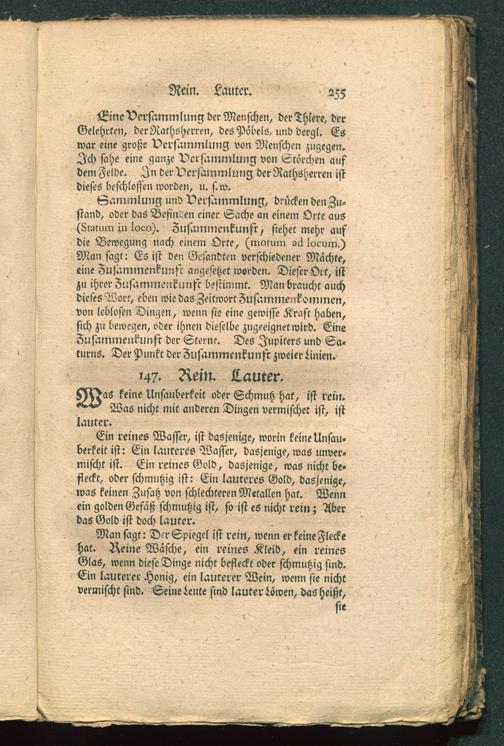 Man sagt: Der Spiegel ist rein, wenn er keine Fleckehat. Reine Wasche, ein reines Kleid, ein reinesGlaS, wenn diese Dinge nicht befleckt oder schmutzig sind.Ein lauterer Honig, ein lauterer Wein, wenn sie nichtvermischt sind. Seine Leute sind lauter Löwen, das heißt,
