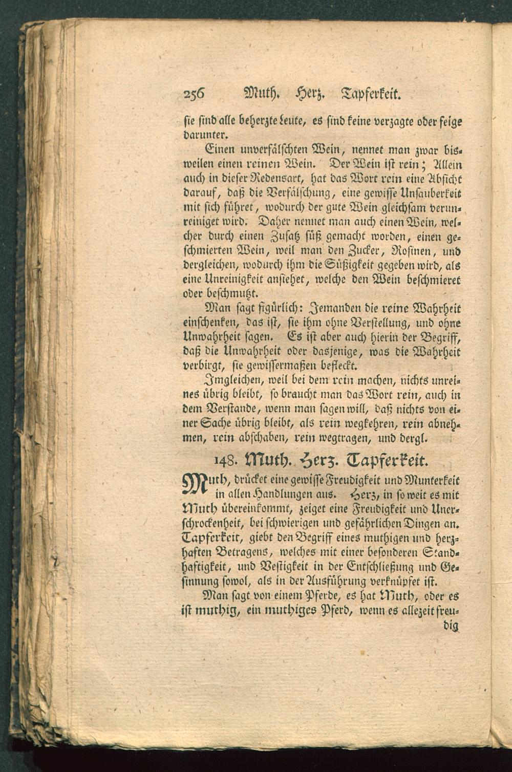 ml), drücket eine gewisse Freudigkeit und Munterkeitin allen Handluugen aus. Herz, in so weit es mitLlnith übereinkommt, zeiget eine Freudigkeit und Uncr-schrockenheit, bei schwierigen und gefährlichen Dingen an.Tapferkeit, giebt den Begriff eines muthigen und herz-haften Betragens, welches mit einer besonderen Stand-haftigkeit, und Vestigkeit in der Entschließung und Ge-sinnung sowol, als in der Ausführung verknüpfet ist.