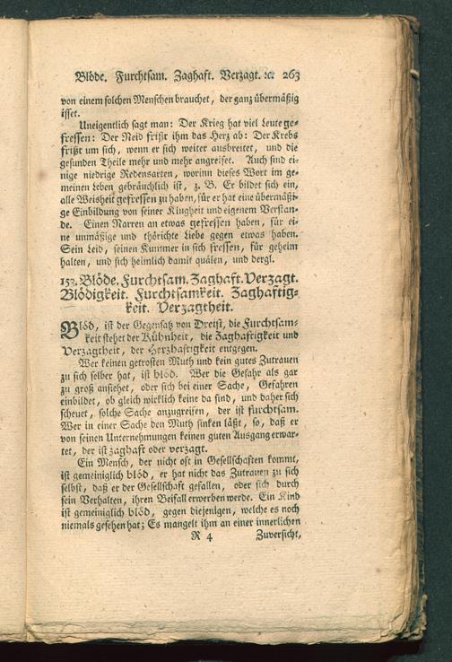 Ein Mensch, der nicht oft in Gesellschaften kommt,ist gemeiniglich blöd, er hat nicht das Zutrauen zu sichselbst, daß er der Gesellschaft gefallen, oder sich durchsein Verhalten, ihren Beifall erwerben werde. Ein indist gemeiniglich blöd, gegen diejenigen, welche es nochniemals gesehen hat; Es mangelt ihm an einer innerlichen