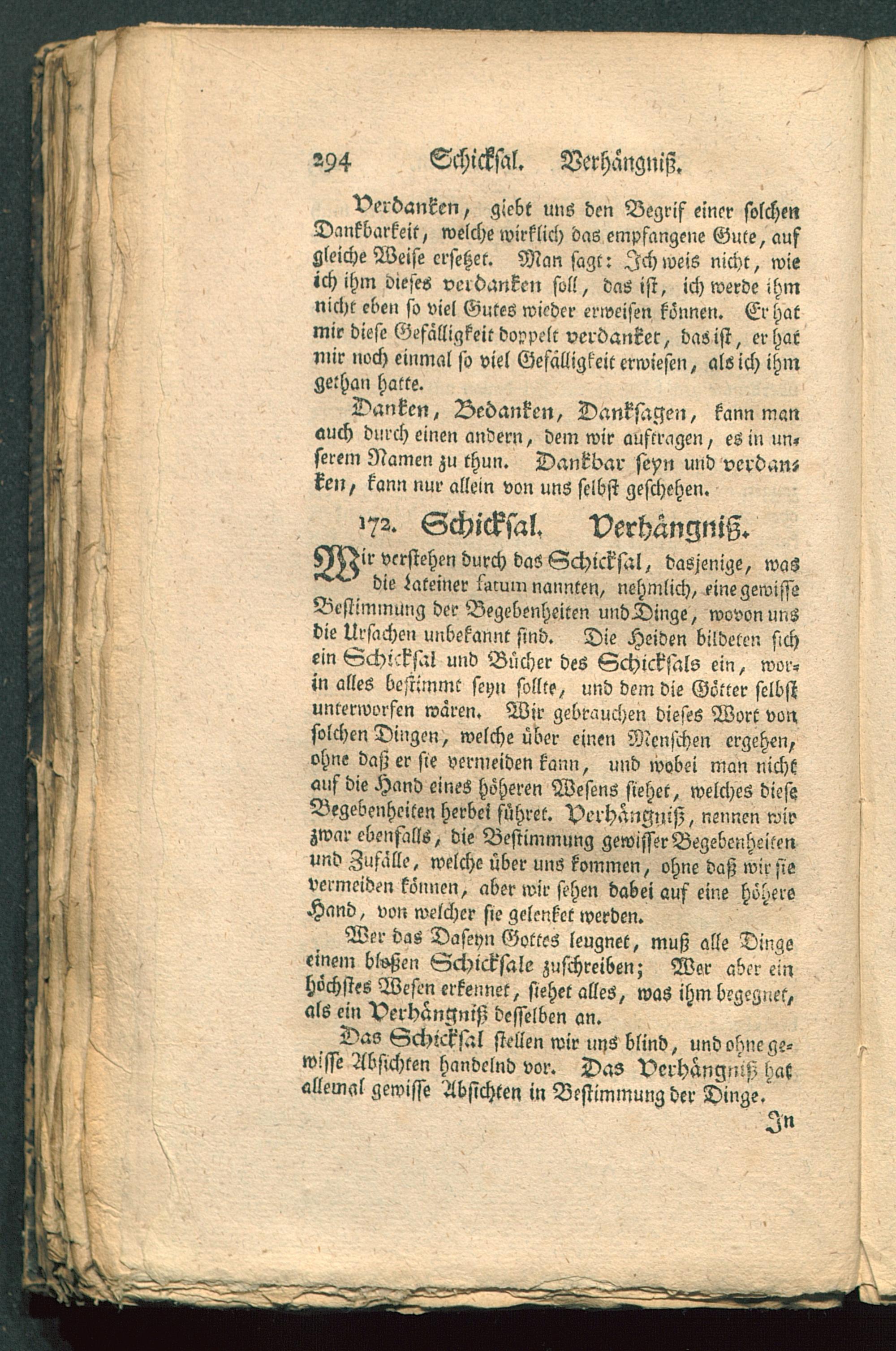 HH >ir verstehen durch das Schicksal, dasjenige, wasdie Lateiner lsrumnannten, nehmlich, einegewissaBestimmung der Begebenheiten undDinge, wovon unsdie Ursachen unbekannt sind. Die Heiden bildeten sichein Schicksal und Bücher des Schicksals ein, wor-in alles bestimmt seyn sollte, und dem die Götter selbstunterworfen wären. Wir gebrauchen dieses Wort vonsolchen Dingen, welche über einen Menschen ergehen,ohne daß er sie vermeiden kann, und wobei man nichtauf die Hand eines höheren Wesens siehet, welches dieseBegebenheiten herbei führet. Verhängnis), nennen wirzwar ebenfalls, die Bestimmung gewisser Begebenheitenund Zufälle, welche über uns kommen, ohne daß wir sievermeiden können, aber wir sehen dabei auf eine höhereHand, von welcher sie gclenkct werden.
