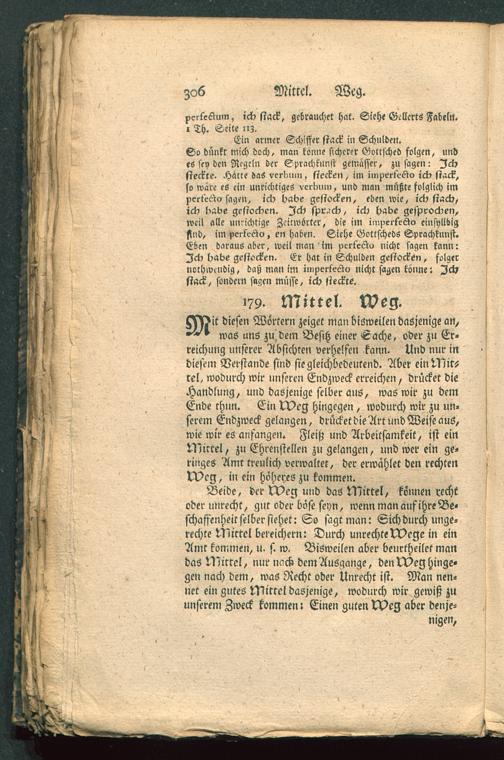 Beide, der lVeg und das Mittel, können rechtoder unrecht, gut oder böse seyn, wenn man aufihreBe-schaffenheit selber siehet: So sagt man: Sich durch unge-rechte Mittel bereichern: Durch unrechte tVege in einAmt kommen, u. s. w. Bisweilen aber beurtheilet mandas Mittel, nur nach dem Ausgange, den 5Veg hinge-gen nach dem, was Recht oder Unrecht ist. Man nen-net ein gutes Mittel dasjenige, wodurch wir gewiß zuunserem Zweck kommen: Einen guten N>eg aber denje-nigen,