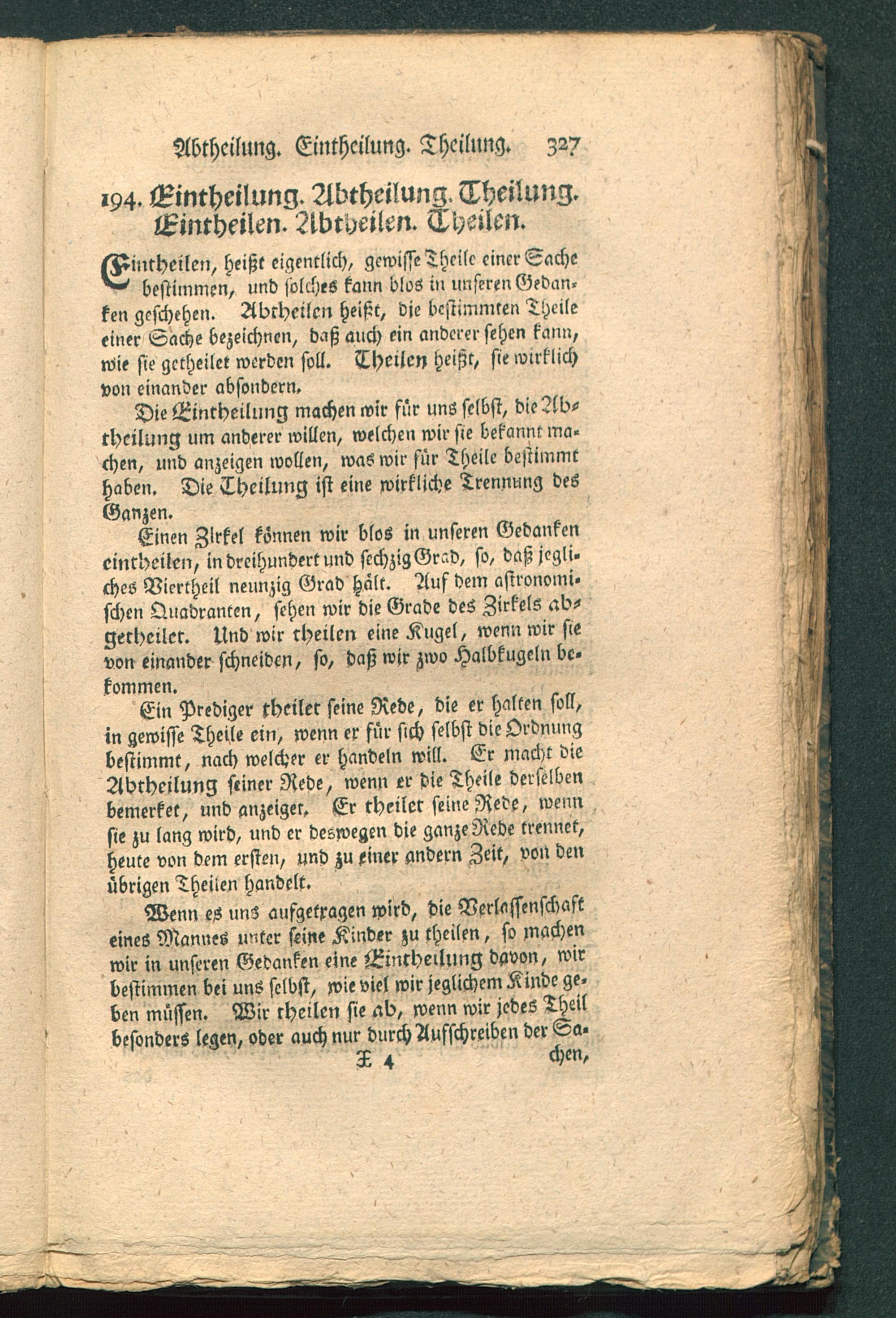 Die Eintheilung machen wir für uns selbst, die Ab-theilung um anderer willen, welchen wir sie bekannt ma-chen, und anzeigen wollen, was wir sür Theile bestimmthaben. Die Theilung ist eine wirkliche Trennung desGanzen.