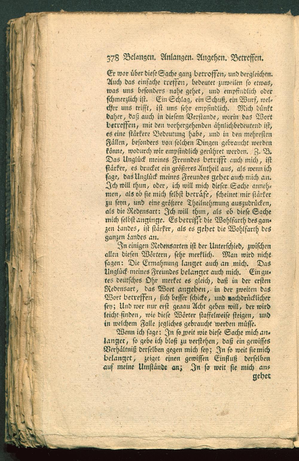 In einigen Redensarten ist der Unterschied, zwischenallen diesen Wörtern, sehr merklich. Man wird nichtsagen: Die Ermahnung langet auch an mich. DasUnglück meines Freundes belanget auch mich. Ein gu-teS deutsches Ohr merket es gleich, daß in der erstenRedensart, das Wort angehen, - in der zweiten dasWort betreffen, sich besser schicke, und Nachdrücklichersey; Und wer nur erst genau Acht geben will, der wirdleicht finden, wie diese Wörter staffelweise steigen, undin welchem Falle jegliches gebraucht werden müsse.