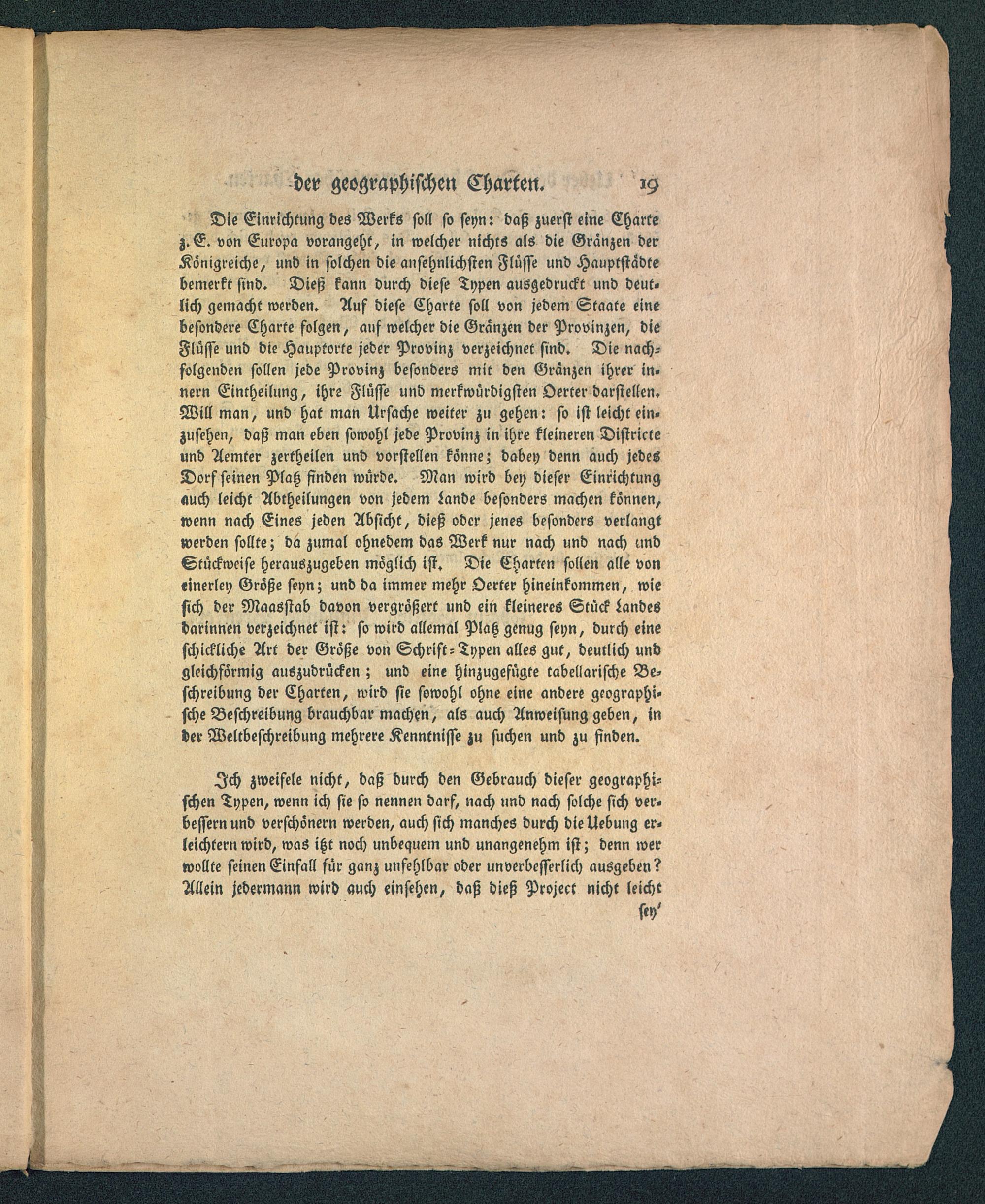 Die Einrichtung des Werks soll so seyn: daß zuerst eine Chartez.E. von Europa vorangeht, in welcher nichts als die Gränzen derKönigreiche, und in solchen die ansehnlichsten Flüsse und Hauptstädtebemerkt sind. Dieß kann durch diese Typen ausgedruckt und deut,lich gemacht werden. Auf diese Charte soll von jedem Staate einebesondere Charte folgen, auf welcher die Gränzen der Provinzen, dieFlüsse und die Hauptorte jeder Provinz verzeichnet sind. Die nach-folgenden sollen jede Provinz besonders mit den Gränzen ihrer in>nern Eintheilung, ihre Flüsse und merkwürdigsten Oerter darstellen.Will man, und hat man Ursache weiter zu gehen: so ist leicht ein-zusehen, daß man eben sowohl jede Provinz in ihre kleineren Districteund Aemter zertheilen und vorstellen könne; dabey denn auch jedesDorf seinen Plah finden würde. Man wird bey dieser Einrichtungauch leicht Abtheilungen von jedem Lande besonders machen können,wenn nach Eines jeden Absicht, dieß oder jenes besonders verlangtwerden sollte; da zumal ohnedem das Werk nur nach und nach undStückweise herauszugeben möglich ist. Die Charten sollen alle voneinerley Größe seyn; und da immer mehr Oerter hineinkommen, wiesich der Maasstab davon vergrößert und ein kleineres Stück Landesdarinnen verzeichnet ist: so wird allemal Platz genug seyn, durch eineschickliche Art der Größe von Schrift-Typen alles gut, deutlich undgleichförmig auszudrücken; und eine hinzugefügte tabellarische Be-schreibung der Charten, wird sie sowohl ohne eine andere geographi-sche Beschreibung brauchbar machen, als auch Anweisung geben, inder Weltbeschreibung mehrere Kenntnisse zu suchen und zu finden.