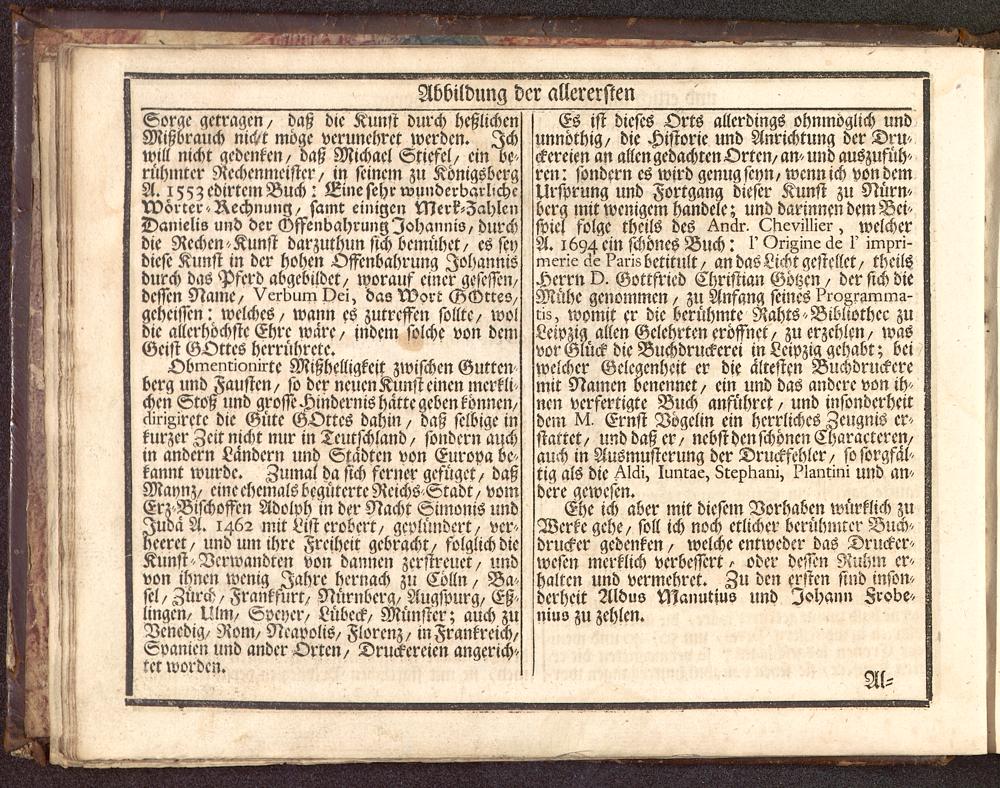 Ehe ich aber mit diesen: Vorhaben würMb ZuWerke gehe/ soll ich noch etlicher berühmter Buch'-drucker gedenken / welche entweder das Drucker-westn merklich verbessert, oder desim Ruhu: er-halten und vermehret. Zu den ersten sind insomderheit 2lldus Manutius und Johann Frobe>-nius zu zehlen.